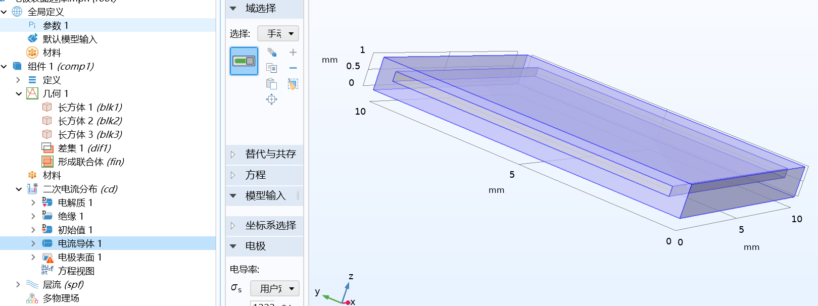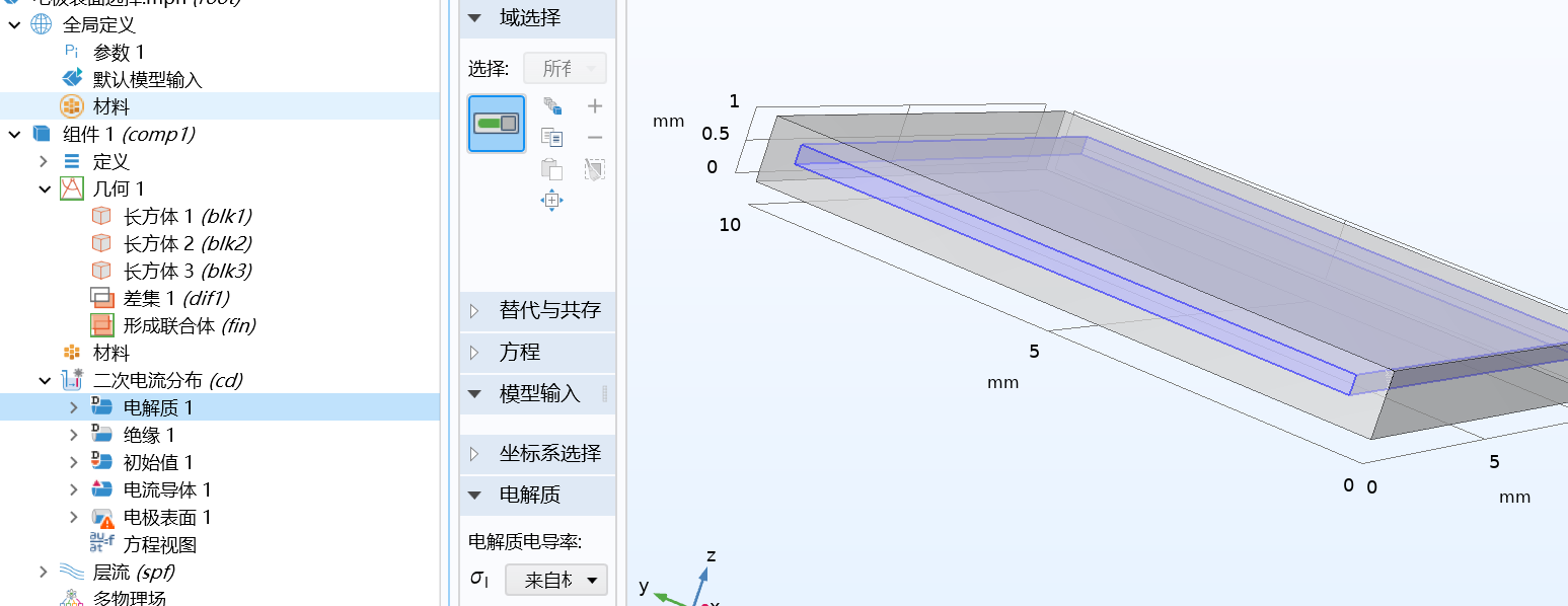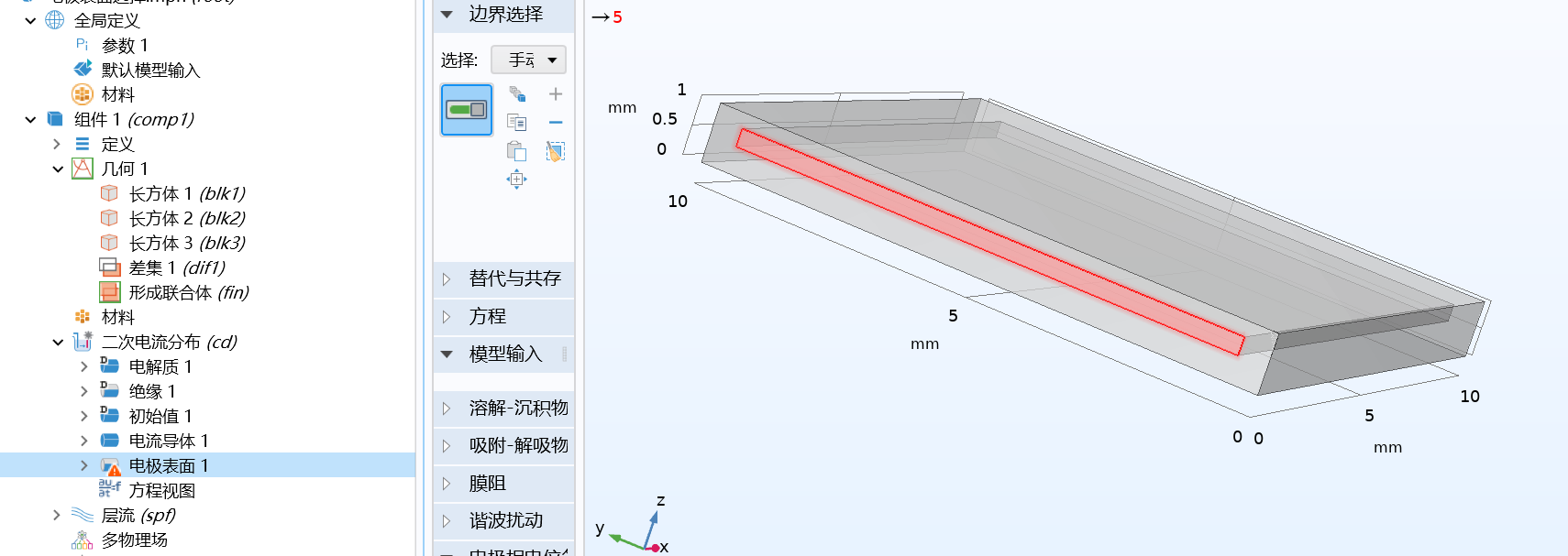 各位大佬求助一下: 我做电化学反应模拟的时候,用的是金属片作为电极基底,在上面做的材料,在构建模型的时候没有用多空电极,而是设置了电流导体和电解质。这两个域接触的地方应该就是电解质和电极的界面。选完电解质和电流导体界面以后,表面反应应该是要选择电解质和电流导体界面的,但是这个边界始终选不上,求大佬指点迷津,这个地方应该证明设置。尝试过切割面,切割对象、抽取面,创建装配体。切割面、切割对象和抽取面都还是不能选取边界界面,创建装配体以后,模型基本上算不出来。图片中展示了问题,附件中上传了模型,用的是6.2版本。过来求助一下,希望得到各位大佬的指点。感激感激。 |