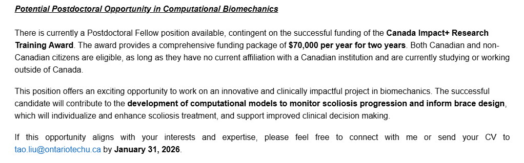 【博士后招聘】加拿大安省理工大学计算生物力学方向(脊柱侧凸精准治疗)诚招博士后