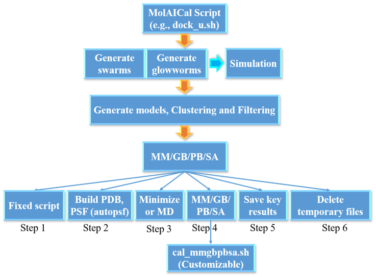 MolAICal官方地址: https://molaical.github.io/ 或 https://molaical.gitlab.io/ 更详细的教程见:https://molaical.gitlab.io/cntutorial.html 或 https://molaical.github.io/tutorial.html 本教程也适用于蛋白-蛋白,蛋白-核酸等虚拟筛选,MolAICal还提供了一种更快速并可以兼容非氨基酸残基类型的多肽筛选方式: https://molaical.gitlab.io/cntutorial.html 中的: 30. 使用MolAICal在受体口袋中进行多肽虚拟筛选 多肽生成的教程,见 https://molaical.gitlab.io/cntutorial.html 中的: 28. 使用MolAICal生成多肽的教程 本教程没有包含附录,更详细教程请见:https://molaical.gitlab.io/cntutorial.html 中的: 29. 使用MolAICal与LightDock进行多肽虚拟筛选教程-同样适用于蛋白质和核酸的虚拟筛选 ________________________________________ 1. 引言 MolAICal 可以使用开源的 LightDock 软件(https://lightdock.org)并通过 MM/GBSA 或 MM/PBSA 方法进一步提升生物大分子对接的准确性。LightDock 是一个开源(GPL-3.0 许可)的对接框架,适用于 蛋白质-蛋白质、蛋白质-肽段、蛋白质-RNA 和 蛋白质-DNA 复合物的对接。它特别擅长处理柔性及具有挑战性的情况(例如瞬时相互作用、低亲和力复合物,或需要主链/侧链灵活性的体系),并且作为一个可扩展平台,支持测试新型打分函数、约束条件或优化策略。LightDock 采用 萤火虫群优化算法(Glowworm Swarm Optimization, GSO)——一种最初为多峰函数优化设计的仿生群体智能方法。 本教程以 胰高血糖素样肽-1 受体(GLP-1R) 与 艾塞那肽-4(exendin-4,首个 FDA 批准的 GLP-1R 激动剂)为例进行演示(PDB ID: 7LLL.pdb)。 注意:本教程仅适用于 Linux 操作系统! 本教程展示了一种通过 MolAICal 与 LightDock 平台集成 实现肽段虚拟筛选的计算流程。MolAICal 能够高效生成并预测多种肽段候选结构的 3D 构象,包括线性和环状变体以及不同二级结构;而 LightDock 则采用先进的群体优化算法,实现高精度的蛋白质-肽段对接模拟。该联合方法使研究人员能够对成千上万种肽段变体进行靶向筛选,基于结合能和相互作用模式识别出有潜力的结合体。通过多尺度建模方法和并行计算能力,该流程显著加速了治疗性肽段、蛋白质抑制剂和核酸结合物的发现过程(只需将肽段替换为蛋白质或核酸即可)。 更多细节请参阅 蛋白质-DNA 和 蛋白质-RNA 对接教程,以及 MolAICal 用户手册。 ________________________________________ 2. 材料 2.1 软件要求 1. MolAICal:https://molaical.github.io 2. NAMD(CPU 版本):https://www.ks.uiuc.edu/Research/namd/ 注意:本教程可使用 NAMD 2.x、3.x 或更高版本。例如,若您使用 NAMD 3.x 版本,则将教程中的命令 “namd2” 替换为 “namd3”。更高版本的 NAMD 亦可采用类似方式替换。 3. PyMol:https://github.com/cgohlke/pymol-open-source-wheels, https://github.com/maabuu/pymol-wheels , https://pypi.org/project/pymol-open-source-whl/ , https://github.com/cnpem/PyMOL4Win 4. VMD:https://www.ks.uiuc.edu/Research/vmd 2.2 示例文件 1. 所有必需的教程文件可从以下地址下载: https://gitee.com/molaical/tutorials/tree/master/028-peptide_vs_lm ________________________________________ 3. 操作流程 3.1 分子准备 为了解决Linux中的库依赖问题,Linux版本的MolAICal (Windows 版本的MolAICal没有采用容器)采用了基于容器的方法。如果需要调用外部程序,建议在MolAICal容器内安装这些程序。如果不需要外部程序,可以忽略此步骤。本教程需要外部程序NAMD和VMD,具体步骤如下: 1. 首先,将文件复制到 MolAICal 容器中 2. 其次,进入 MolAICal 容器的虚拟环境 注:molaical 是容器名称。 3. 在 MolAICal 容器虚拟环境中安装软件的方式与在本地主机上安装相同。以下以安装 VMD 和 NAMD 为例: 1) 安装 NAMD: 解压 NAMD 文件(假设解压后的文件夹名为 namdcpu),然后使用以下命令将其路径告知 MolAICal: 注:请将上述 VMD 和 NAMD 的路径替换为您系统中的实际路径。-n 后面的 "VMD" 和 "NAMD"(大小写不敏感)是固定的标识符。为确保 MM/GBSA 结果的可重复性,建议使用 NAMD 的 CPU 版本,因为 CUDA 版本中的 seed 参数似乎对结果可重复性无效。 2) 安装 VMD: 按以下步骤操作: 解压 VMD 文件: 注:请将上述路径替换为您系统中的实际路径。 修改 VMD 解压目录中名为 configure 的文件中的安装路径: 安装 VMD: 注:请运行 ./configure 并根据所用计算机选择正确的类型,此处为 "LINUXAMD64"。 然后使用以下命令将 VMD 路径告知 MolAICal: 至此,NAMD 和 VMD 在 MolAICal 容器内的安装与配置已完成。为防止MolAICal出现问题时丢失已安装的程序(例如VMD和NAMD),请参阅附录2中的第3步。 进入教程材料文件夹 “028-peptide_vs_lm”: 将看到以下文件列表: 7LLL.pdb:来自 https://www.rcsb.org 的复合物结构文件(PDB 格式) dock_u.sh:对接单元脚本(适用于本教程类似的膜蛋白受体) dock_u_nomem.sh:对接单元脚本(适用于非膜蛋白受体) dock_u_cyc.sh:环肽与膜蛋白的对接单元脚本 dock_u_cyc_nomem.sh:环肽与非膜蛋白的对接单元脚本 mempro.pdb:本受体对应的膜蛋白受体(制备方法见附录 1或 MolAICal 蛋白质-肽段对接教程) new.pdb:受体构建过程中的临时文件 P_peptide.pdb:从 “7LLL.pdb” 中提取的肽段配体(制备方法见附录 1或 MolAICal 蛋白质-肽段对接教程) restraints.list:指定活性位点的文件,可减少构象搜索的对接时间(制备方法见附录 1) R_protein.pdb:从 “7LLL.pdb” 中提取的受体文件(制备方法见附录 1) R_P_complex.pdb:包含肽段配体和受体的复合物文件(制备方法见附录 1) 选项:LightDock中的DFIRE评分函数需要标准氨基酸残基及其原子名称,因此在使用DFIRE评分
