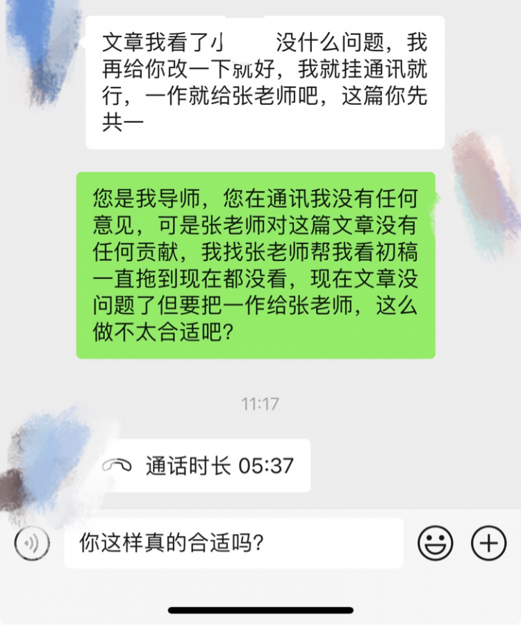 这件事涉及到我们课题组的一些特殊情况:我的导师与图中的张老师是夫妻关系。我有申请博士的打算,但组内老师对我们基本处于半放养状态,我就自己请了科研辅导嘛,准备发表两篇文章用来申博,现在是见刊了一篇二区,还有一篇文章刚刚完成 在这篇文章初期,我导师确实给予了一些建议,我也很感激他当初接收我进入课题组。因此,他作为通讯作者我没有任何意见。但我无法接受的是,他的妻子成为第一作者,而我仅被列为共一。他说他老婆评职称需要文章,但这凭什么要以我的成果为代价?导师清楚这篇文章是我自费请辅导完成的,也完全了解我有申博的意向,并承诺事后帮我申博,这样的安排,真的问心无愧吗?我要相信他吗? 发自小木虫IOS客户端 |