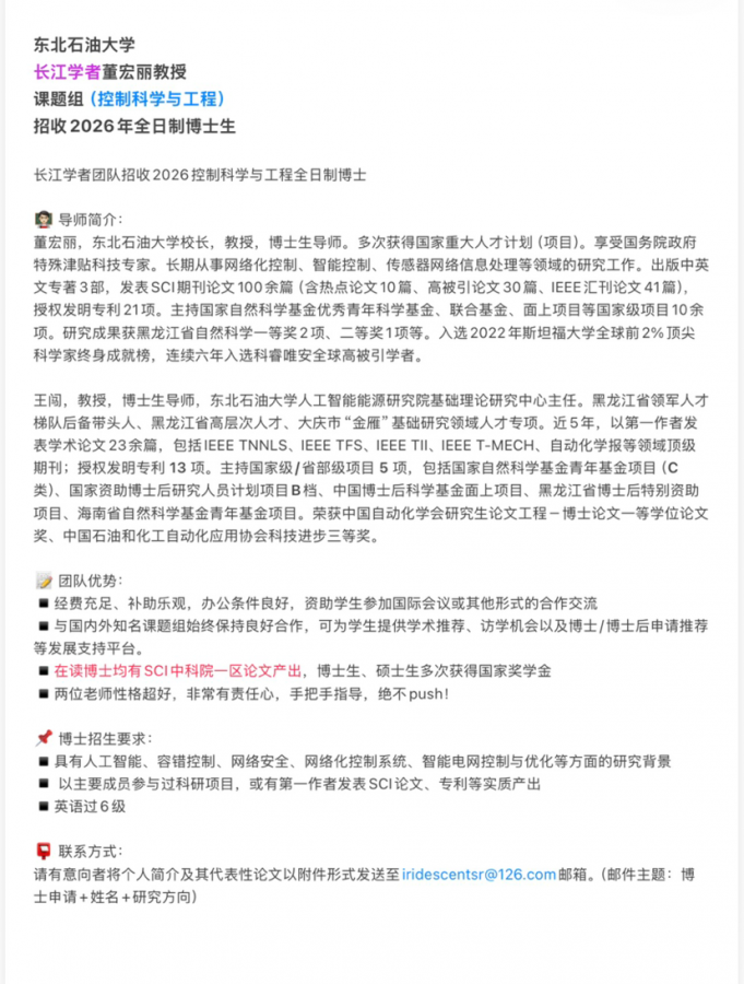 联系方式: 请有意向者将个人简介及其代表性论文以附件形式发送至iridescentsr@126.com邮箱。(邮件主题:博士申请+姓名+研究方向) 学校官网简介 董宏丽教授:https://www.nepu.edu.cn/info/1005/1066.htm 王闯教授:https://dqxxgcxy.nepu.edu.cn/info/1065/3501.htm 发自小木虫IOS客户端 |