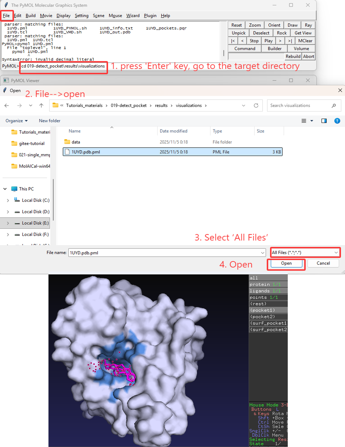 1. 引言 为了后续AIDD的智能化,MolAICal集成了P2Rank和 fpocket两个模块用于发现蛋白的活性位点。当蛋白质受体未结合配体,或其活性口袋尚无相关报道时,就需要对其活性位点进行预测。 P2Rank 和 fpocket是两款常用的开源工具,均可用于识别受体中的潜在活性口袋。其中,fpocket 主要基于几何和拓扑原理(具体为沃罗诺伊镶嵌法),而 P2Rank 则以机器学习为核心,整合了局部表面特征与聚类技术。在应用场景上,fpocket 适用于蛋白质结构数据库的快速大规模筛选;相比之下,当需要更高的预测精度、基于机器学习的结果优化,以及对顶级候选结合位点进行优先级排序时,P2Rank 更为合适。 2. 材料 2.1 软件要求 1)MolAICal:https://molaical.github.io 2)PyMOL:https://github.com/cgohlke/pymol-open-source-wheels 安装 PyMOL 需依赖 “pip” 工具。用户可先安装 Miniconda(下载地址:https://www.anaconda.com/docs/getting-started/miniconda/install),再运行以下命令: 最后,搜索关键词 “pymol.exe”,找到该文件后创建桌面快捷方式。双击桌面快捷方式,即可启动 PyMOL。 2.2 示例文件 1)本教程所需的全部示例文件可从以下链接下载: https://gitee.com/molaical/tutorials/tree/master/019-detect_pocket 3. 操作步骤 3.1 利用 p2rank 和 MolAICal 检测活性口袋 进入 “019-detect_pocket” 文件夹,运行以下命令: 结果将保存在 “results” 文件夹中。在 PyMOL 中输入命令 “cd 019-detect_pocket\results\visualizations”,进入目标文件夹;随后在 PyMOL 中打开 “results\visualizations” 目录下的 “1UYD.pdb.pml” 文件,即可显示潜在活性口袋(见图 1)。显然,排名第一的活性口袋即为配体结合区域。 图1 3.2 利用 fpocket 和 MolAICal 检测活性口袋 进入 “019-detect_pocket” 文件夹。 目前,fpocket 仅支持在 Linux 系统中运行,运行以下命令: 结果将保存在 “1UYD_out” 文件夹中。按与上述类似的操作:在 PyMOL 中输入命令 “cd 019-detect_pocket\1UYD_out” 进入目标文件夹,然后在 PyMOL 中打开 “019-detect_pocket\1UYD_out” 目录下的 “1UYD.pml” 文件,即可显示潜在活性口袋(见图 2)。同时加载 “1UYD.pdb” 文件中的配体,可观察到排名第一的口袋同样包含配体结合位点,这表明 fpocket 也能准确识别蛋白质受体的活性口袋。 图2 |