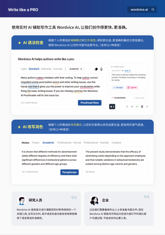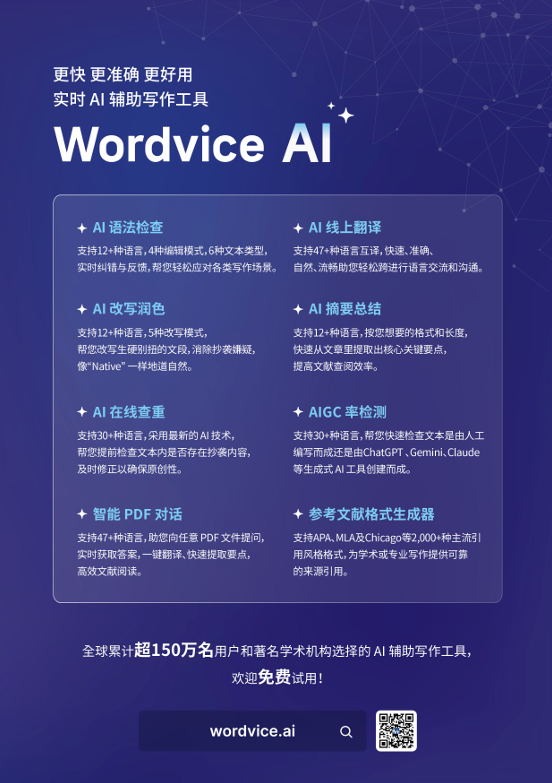 还在为论文的英语语法、表达和重复率操心吗?今天给大家推荐 “组合神器”—— wordvice ai 智能写作工具及其专业英文翻译润色服务。将完美解决从初稿打磨到最终投稿前的全流程语言问题,特别适合研究生和科研工作者。 1. ai 智能工具:你的24小时在线写作协作者 网址:https://wordvice.ai/cn 这个 ai 工具集成了多个非常实用的功能,基本覆盖了学术写作的刚需:
