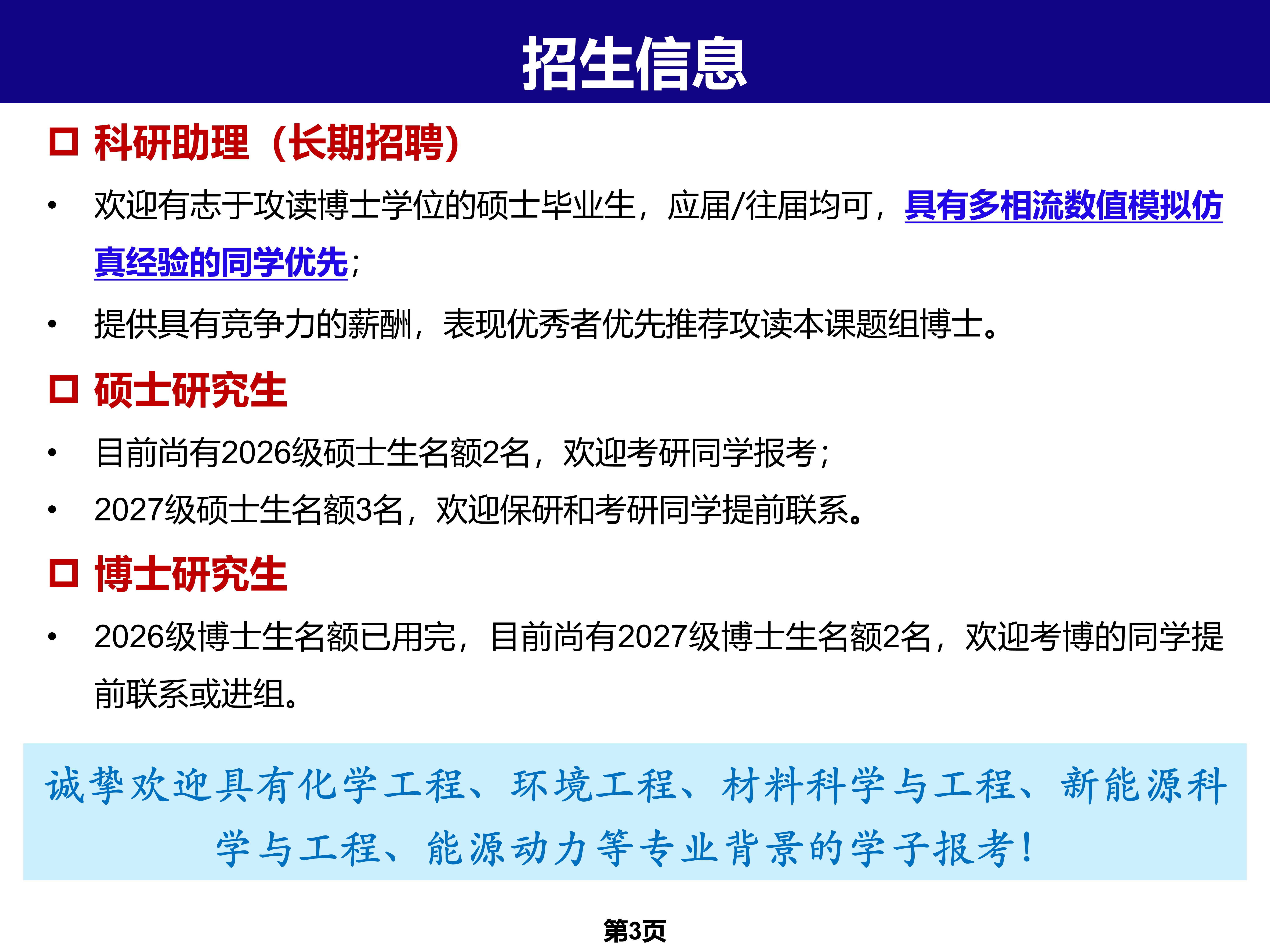 导师简介: 徐加陵,南京大学能源与资源学院特聘研究员、助理教授,博士生导师。2022年获西安交大动力工程及工程热物理博士学位,2023.03-2025.07在上海交大从事博士后研究,2025.09入职南京大学。截止目前,已获批主持国家级/省部级课题多项,发表国内外学术论文30余篇,申请国家发明专利20余项,作国内外学术会议邀请/口头报告10余次。 培养理念: 初为人师,诚惶诚恐,唯有倾尽全力,方能不负学生厚望;与学生共同成长,互相尊重,携手共进,开心、快乐科研,享受生活。期待您的加入! 主要研究方向包括: (1)生物质/固废热化学法制多孔功能材料; (2)微/介孔界面的气-固两相反应流数值模拟; (3)太阳能光热储能综合利用; (4)热化学转化与清洁能源耦合系统构建与仿真。 招生信息: 科研助理(长期招聘):(1)欢迎有志于攻读博士学位的硕士毕业生,应届/往届均可,具有多相流数值模拟仿真经验的同学优先;(2)提供具有竞争力的薪酬,表现优秀者优先推荐攻读本课题组博士。 硕士研究生:(1)目前尚有2026级硕士生名额2名,欢迎考研同学报考;(2)2027级硕士生名额3名,欢迎保研和考研同学提前联系。 博士研究生:2026级博士生名额已用完,目前尚有2027级博士生名额2名,欢迎考博的同学提前联系或进组。 诚挚欢迎具有化学工程、环境工程、材料科学与工程、新能源科学与工程、能源动力等专业背景的学子报考! 课题组目前处于初创期,亟需优秀的你加入!请感兴趣的同学发邮件联系徐老师作进一步的沟通! 个人邮箱:xujialing@nju.edu.cn 官方主页:https://sser.nju.edu.cn/info/1003/3651.htm |