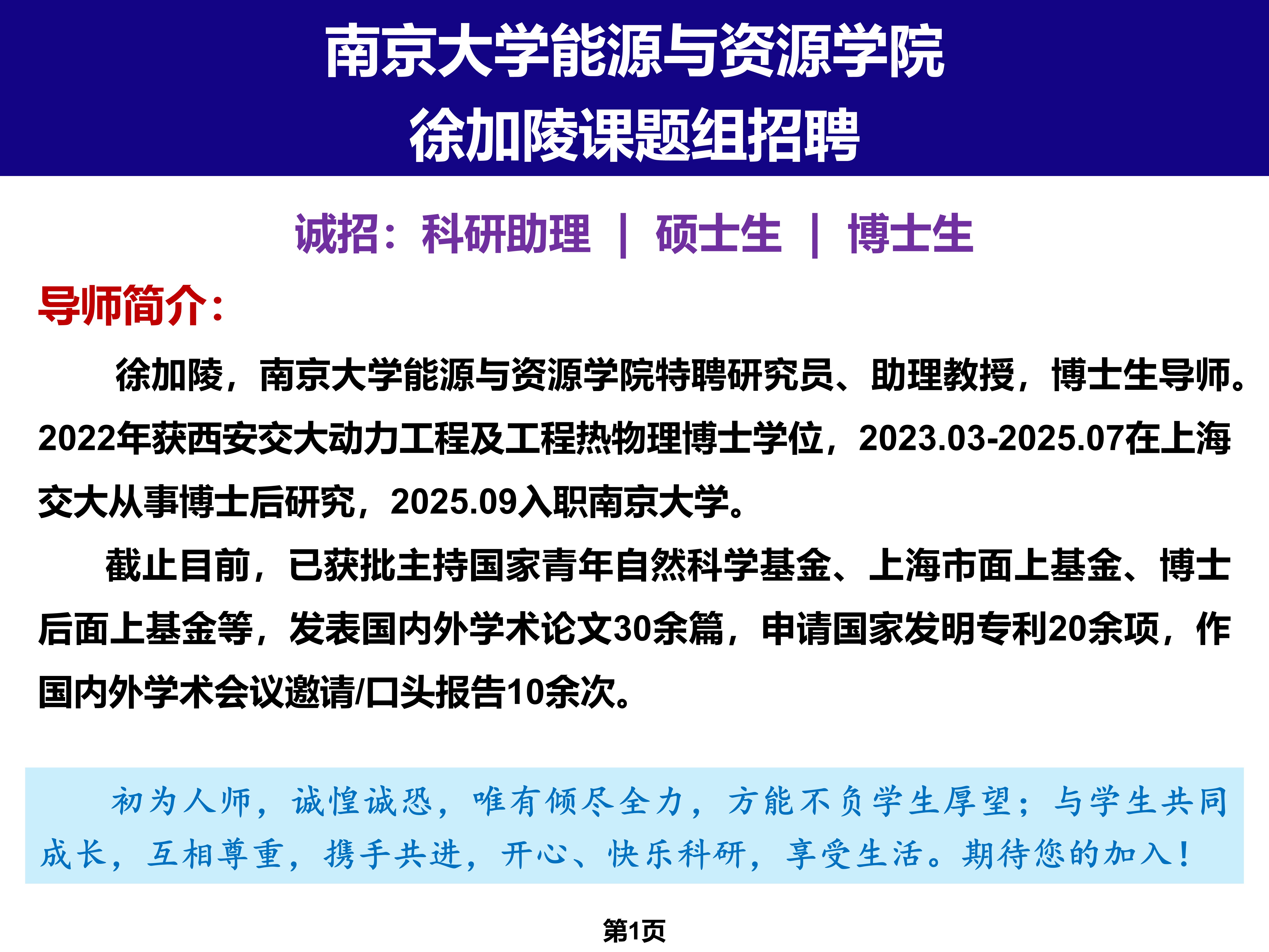 南京大学能源与资源学院徐加陵课题组招聘:科研助理、硕士生、博士生