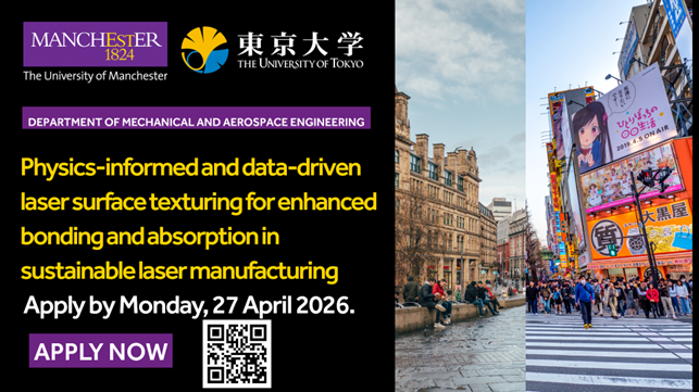 博士招聘:智能制造/激光表面加工/激光增材及焊接; • 国际生,全奖, 双学位 (2+2):dual-award phd programme between the university of manchester and the university of tokyo. • 截止日期:april 27, 2026。 • 入学要求:拥有与研究方向相关的本科二等一级荣誉学位(2:1)或拥有任意专业的本科二等一级荣誉学位(2:1),或者获得与研究方向相关的硕士学位,成绩达到良好或相当水平。 • 学术背景要求:机械,机电,计算机,材料,光学,电磁及电子信息工程背景。 • 语言要求: ielts 6.5 overall with a minimum of 6 in writing and listening, and 5.5. in all other sub-tests 或者toefl ibt: at least 90 overall with no subtest below 20. • to apply, please contact the supervisor, dr. yuze huang: yuze.huang@manchester.ac.uk. please make sure to include your cv with a list of publications, details of your current level of study, academic background and english language certificate. • 招生广告:(uom - tokyo) physics-informed and data-driven laser surface texturing for enhanced bonding and absorption in sustainable laser manufacturing at the university of manchester on findaphd.com: https://www.findaphd.com/phds/pr ... ufacturing/?p194698 |