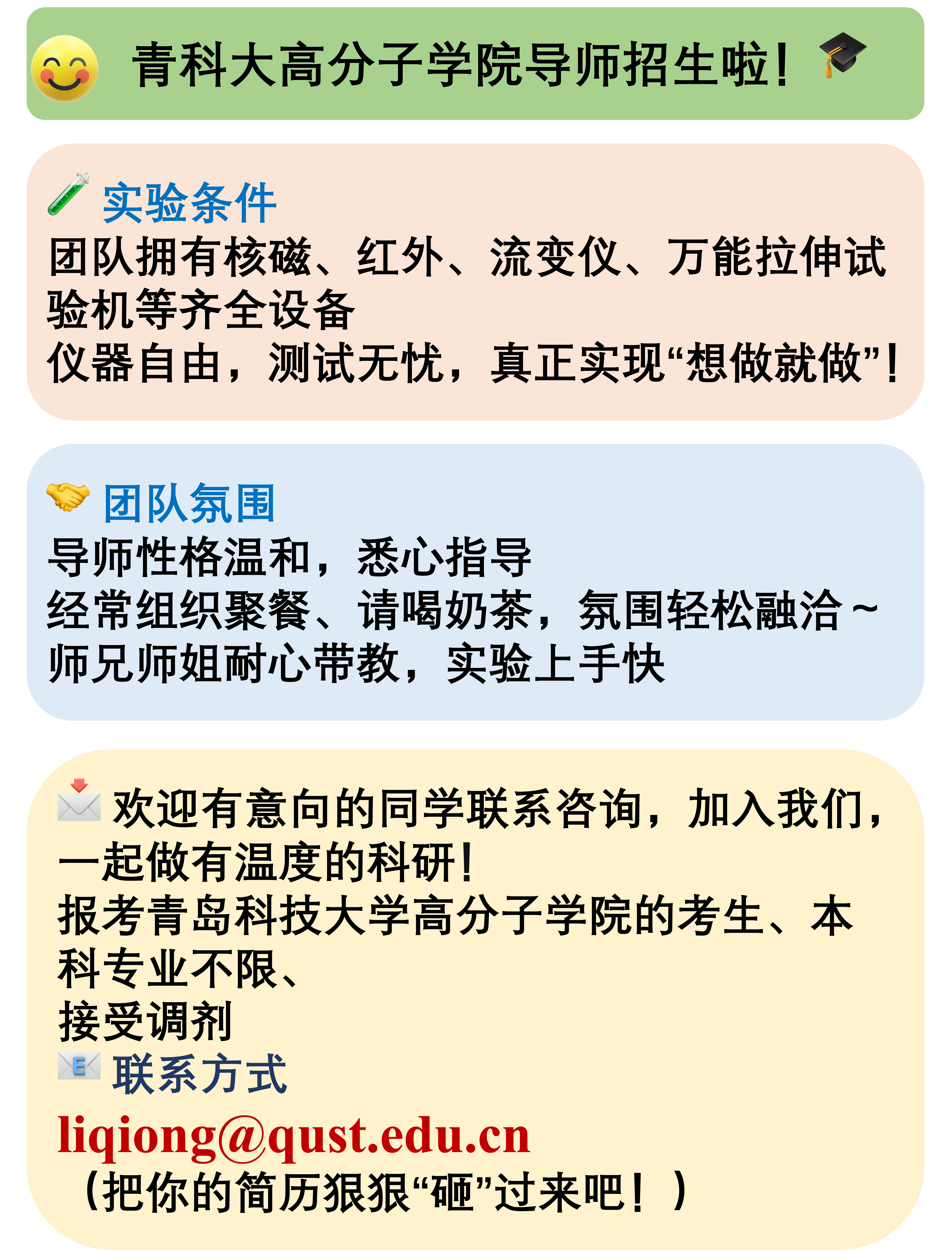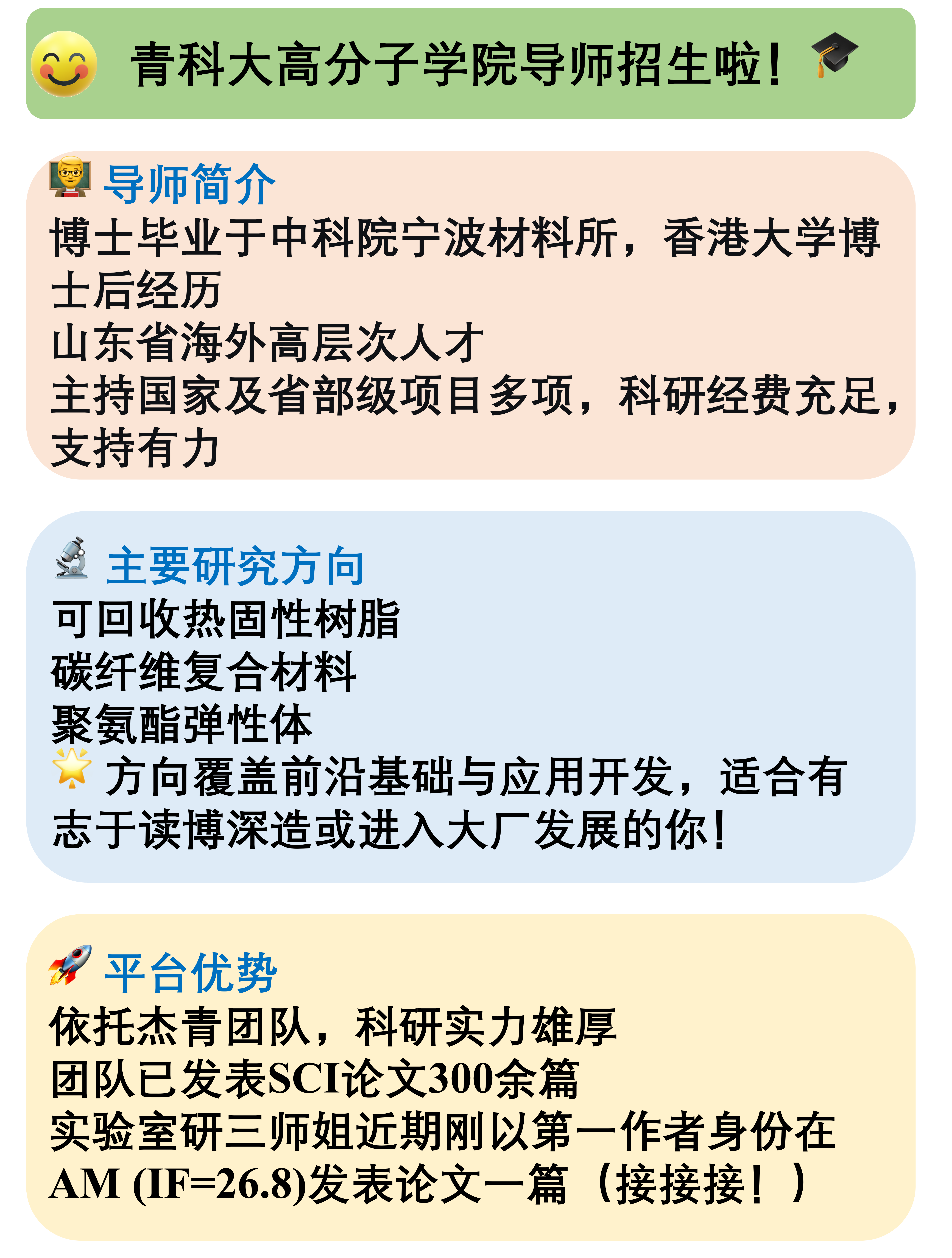 青科大高分子学院导师招生啦!🎓 👨🏫 导师简介博士毕业于中科院宁波材料所,香港大学博士后经历; 山东省海外高层次人才主持国家及省部级项目多项,科研经费充足,支持有力 🔬 主要研究方向 可回收热固性树脂 碳纤维复合材料 聚氨酯弹性体🌟 方向覆盖前沿基础与应用开发,适合有志于读博深造或进入大厂发展的你! 🚀 平台优势依托杰青团队,科研实力雄厚 团队已发表SCI论文300余篇 实验室研三师姐近期刚以第一作者身份在AM(IF=26.8)发表论文一篇(接接接!) 🧪 实验条件 团队拥有核磁、红外、流变仪、万能拉伸试验机等齐全设备仪器自由,测试无忧,真正实现“想做就做”! 🤝 团队氛围导师性格温和,悉心指导经常组织聚餐、请喝奶茶,氛围轻松融洽~ 师兄师姐耐心带教,实验上手快 📩 欢迎有意向的同学联系咨询,加入我们,一起做有温度的科研! 报考青岛科技大学高分子学院的考生、本科专业不限、接受调剂 📧 联系方式liqiong@qust.edu.cn(把你的简历狠狠“砸”过来吧!) |