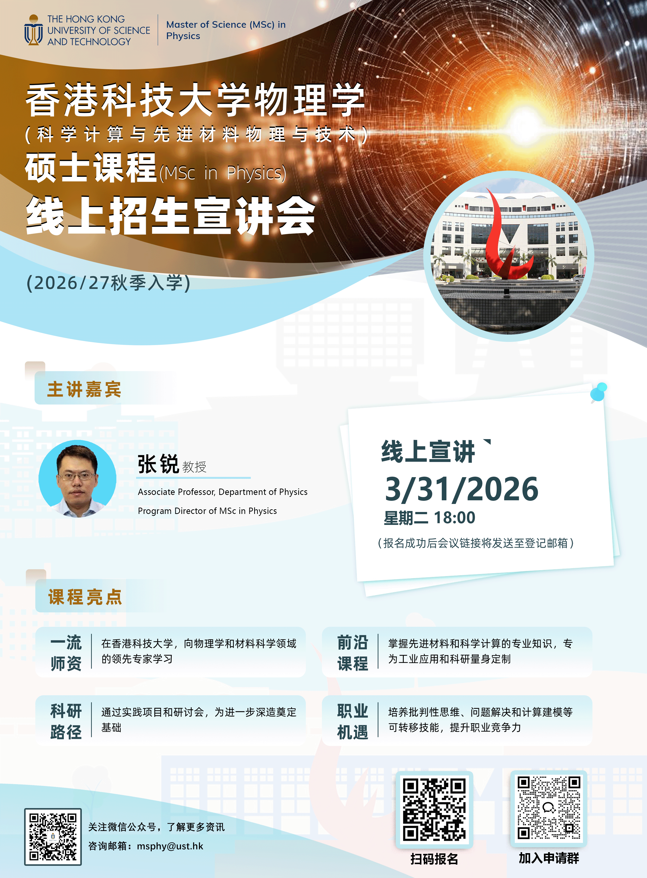 香港科技大学物理学(科学计算与先进材料物理与技术)理学硕士26FALL入学!线上招生宣
