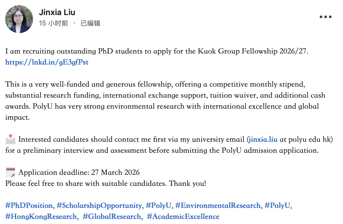 香港理工大学Prof. Jinxia Liu课题组招收全奖博士生