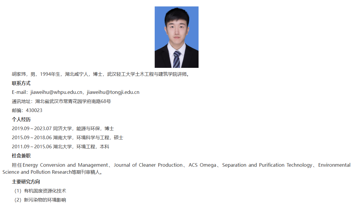 武汉轻工大学土建学院新晋硕导,招收土木水利专硕,研究方向为污水/固废生物处理技术。 本人情绪稳定,有耐心,为人友善,与学生平等交流,会亲力亲为指导实验、写论文,有成熟的研究方向,只要认真做比较容易出成果。 给予充分的自由度,不要求打卡,该学习的时候好好学,想放松的时候就休息,任何时候身体健康最重要。 良好的师生关系是相互成就的,欢迎具有环境/市政/土木等相关专业背景的同学报名,一起努力出成果! 目前还剩1个招生指标,有意向的同学请将本科成绩单和个人简历发给我, 联系邮箱:jiaweihu@whpu.edu.cn 详细信息可见学校个人主页: https://tm.whpu.edu.cn/info/1204/2675.htm |