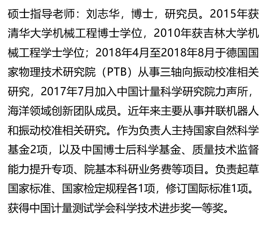 中国计量科学研究院是国家最高计量科学研究中心,保持国家最高测量能力。职工1000余人。中国工程院院士2人,高级研究人员300人。保存国家计量基准128项,标准346项,标准物质1538项,国际计量局(bipm)公布的国际互认的校准和测量能力1523项,国际排名第四、亚洲排名第一。1980年以来,国家科学技术奖80项,省部级奖近400项。近些年获得国家科技进步奖13项。目前在北京四个园区、其中市区和昌平的园区最大,有青岛、海南、漠河等基地。 导师信息如图所示 研究生学习安排: 1、研究生第一年:理论课学习,中国科学院大学,第二年第三年回中国计量科学研究院完成学位论文 2、科研条件充分、实验仪器丰富; 3、与国内很多著名企业以及国外研究机构有密切联系,就业前景好,收入待遇高; 4、相关技术研究内容:1)并联机器人优化与控制;2)多自由度运动测量;3)传感器信息融合。 研究生要求: 1、本科为机械、仪器、测控等理工科专业均可报名和交流; 2、要求有志于从事科学研究,踏实认真,动手能力强; 联系方式:有意者请发送详细简历、考试科目及成绩、本科成绩表至liuzhihua@nim.ac.cn 其他具体信息请参考官网https://www.nim.ac.cn/node/3582 #考研调剂 #仪器科学与技术 #机械 #自动化 #测控 |