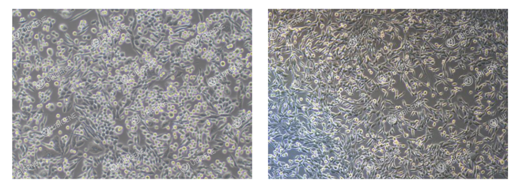 LLC细胞来源于C57BL小鼠肺组织,是经典的高转移、高耐药肿瘤模型,广泛用于肿瘤转移及化疗机制研究。小源带你一站式解锁LLC细胞培养技巧与基因编辑实操关键点! 一、小鼠肺癌细胞(LLC)基本信息 细胞名称:小鼠肺癌细胞(LLC) 细胞形态:上皮样、圆形细胞混合 细胞培养条件:90%DMEM+10%FBS 气相:空气,95%;二氧化碳,5% 温度:37℃ 换液频次:传代时换液 传代比例:1:2-1:3 细胞生长状态参考: l 正常状态:细胞形态不均一,上皮样细胞与圆形细胞同时存在,比例不定,均以贴壁状态存在;可能存在少量悬浮细胞。(见下图) l 异常状态: 细胞拉丝或拉长;细胞萎缩、变圆;细胞碎片增多。(见下图) 二、LLC细胞复苏流程 1.准备培养基 取7mL完全培养基于离心管中备用。 2.细胞解冻 将细胞从干冰里取出,用镊子夹住盖子放入 37℃水浴中快速晃动(注意:水不能没过盖子),使其在1分钟左右完全融化,直至冰块融化至绿豆大小,停止水浴。 3.细胞离心 将解冻后的细胞悬液转移至离心管中,1100rpm条件下离心4分钟,弃去上清液。 4.重悬与接种 用完全培养基重悬细胞,接种于合适大小的培养皿或培养瓶中。 5.细胞培养 将培养皿或培养瓶置于37℃培养箱中培养,24小时后观察细胞状态及贴壁情况。 三、LLC细胞传代步骤(以T25瓶为例) 1. 传代条件 l 当细胞汇合度达到80-90%时可进行传代。 l 传代时在超净台内弃去培养瓶里的培养液,加入5mLPBS洗涤细胞1-2次。 2.胰酶消化 l 加入1mL胰酶,轻轻晃动瓶子并使胰酶完全浸过细胞。 l 将培养瓶放入培养箱孵育 1-2分钟。 l 待在显微镜下观察到大部分细胞变圆变亮,轻轻晃动培养瓶两侧有大部分细胞脱落时,立即终止消化。 3.终止消化 l 加入2倍胰酶体积即2mL完全培养基终止消化。 l 然后转移至15mL离心管中。 4.细胞悬液离心 l 1100 rpm 室温离心 4 分钟。 l 离心结束,弃去上清,加入完全培养基重悬细胞。 5.传代培养 l 细胞按照1:2-1:3比例传代。 l 传代第二天观察细胞状态。 四、LLC细胞冻存步骤 1. 收集细胞 按照细胞传代的过程收集消化好的细胞到离心管中。 2.离心 1100rpm条件下离心4分钟,去掉上清。 3.重悬与冻存 用细胞冻存液重悬细胞,按每1mL冻存液含1×10^6个细胞/mL分配到冻存管中,标注好名称、代数、日期等信息。 4.降温与储存 将冻存管置于程序降温盒中,-80℃冰箱中过夜后转入液氮罐内保存。 五、LLC细胞培养要点与注意事项 1.细胞状态控制:建议在细胞达到约80%融合度时进行传代,以维持良好生长状态。 2.培养基保存:培养基需避光存放于4°C,并在有效期内使用,确保稳定性。 3.培养环境稳定:保持培养箱温度、湿度及CO₂浓度正常,避免环境波动影响细胞状态。 4.操作温度管理:实验前需将培养基和胰酶预热至37℃,以减少温度变化带来的应激反应。 5.传代操作规范:操作过程中避免剧烈吹打,防止损伤细胞膜;若细胞贴壁分布不均,可轻轻摇动培养瓶使其均匀分布。 6.血清质量选择:LLC细胞对血清品质较为敏感,建议使用高质量胎牛血清培养,以保证细胞正常贴壁生长,避免状态异常。 【小提示】:培养过程中可能会出现少量悬浮细胞。若贴壁细胞为主,可直接弃去悬浮细胞;若悬浮细胞比例较高,可通过离心收集后重新接种至培养瓶中。 六、LLC细胞转染时注意事项 1.细胞状态要求 确保细胞状态良好,使用对数生长期即70-80%汇合度在的细胞。 细胞80%活率>,可通过台盼蓝进行检测。 使用低代次细胞。 注意细胞消化时间,避免过度消化,对细胞造成伤害。 实验过程中细胞要吹打成单细胞,避免细胞聚团。 2.转染试剂与预实验 转染试剂使用前需要充分混匀保证其均匀性。 建议进行药筛预实验找到最佳药筛浓度,以便于转染后进行药筛。 3.电转法 控制细胞量,电转后根据细胞量接种至合适的培养板里。 使用温和的胰酶,并用含血清的培养基彻底终止消化。 用PBS洗涤细胞1-2次,彻底去除残留血清,避免离子干扰电穿孔。 进行预实验对电转参数进行优化。 保证电转后细胞≥50%贴壁率。 控制实验时间,电转全程不宜过长。 4.慢病毒法 建议先进行预实验,以确定最合适的MOI条件。 感染前将细胞汇合度控制在30–40%,避免过度生长影响感染效率。 病毒感染前加入助染剂Polybrene,以提高感染效果。 感染24小时后及时更换培养基。 病毒液使用过程中应避免反复冻融,以防活性下降。 若感染效率较低,可考虑进行复感染(前提是细胞对病毒具有良好耐受性),或尝试采用离心感染方式提升效率。 七、LLC细胞铺单克隆实验注意事项 1.细胞状态要求 l 使用对数生长期的细胞进行铺克隆,铺克隆前细胞汇合度建议控制在60%-70%左右。 l 铺克隆时细胞活率≥80%。 2.试剂与预实验 l 提前预温所有试剂(包括培养基、PBS)。 l 建议使用温和消化试剂(如TrypLE Express)。 3.铺板策略 l 进行预实验找到合适的铺克隆梯度,避免单克隆占比太低。 l 细胞接种96孔板时需确保细胞分布均匀;外围96孔加入PBS防止蒸发。 l 在单克隆培养期间,需要避免频繁晃动,以减少单细胞克隆脱落或迁移的风险。 4.稀释方法 l 使用“极限稀释法”进行铺克隆。 l 稀释细胞计数后结果最好落在1*10^6-2*10^6之间。 源井生物LLC细胞相关产品推荐 源井生物为您提供稳定可靠的LLC细胞,欢迎进入源井·万象全品类细胞库红棉搜索,库内所有人源和鼠源的细胞均可提供STR鉴定报告,保障细胞身份准确;源井生物拥有超 1000 种野生型细胞,覆