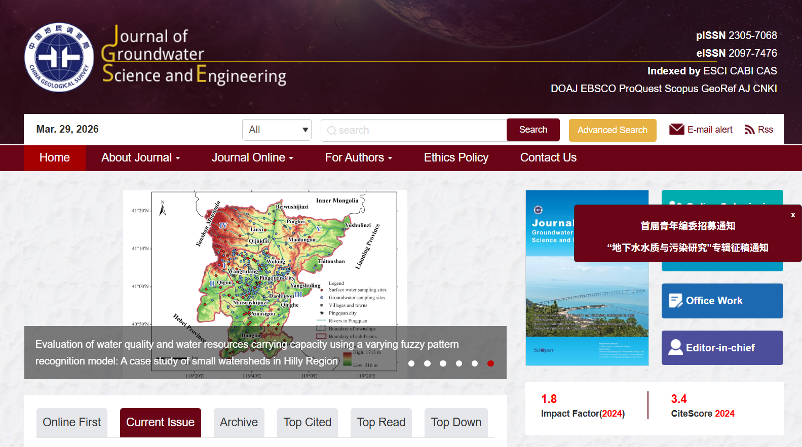 Journal of Groundwater Science and Engineering期刊 中科院三区 地下水方向:地下水化学、地下水水质与污染、地下水资源、地下水生态、地下水相关的地质灾害与地热、以及其他地下水相关方向。 开源且免出版费 从今天开始,新投稿的审稿速度加快(一般情况下,5天内决定是否送审,2个月内出审稿意见,若审稿进度慢,可直接依据稿号联系huangguanxing2004@126.com) 期刊网址:https://gwse.iheg.org.cn/index.htm |