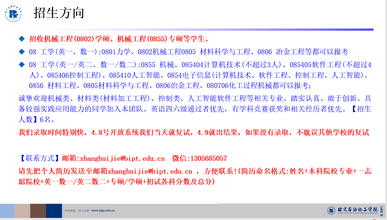北京石油化工学院康举老师团招2026年研究生复试调剂考生,欢迎联系,请说明研究生初试成绩、数一英一或者数二英二,课题组资源丰富,科研氛围极好,好就业,机械专业、材料、电气、自动化都可以报考,学校调剂信息链接:https://mp.weixin.qq.com/s/xfbicfz3khD69uVaogtflg 我们团队可以报考专业如下: 08工学(英一/英二、数一/数二):0855机械、085404计算机技术(不超过3人)、085405软件工程(不超过4人)、085406控制工程(不超过3人)、085410人工智能(不超过3人)、085400电子信息(计算机技术、软件工程、控制工程、人工智能)(不超过4人)、085601材料工程(不超过5人)、080503材料加工(不超过3人), 专硕学硕都招调剂生,学硕2名,专硕4人, 欢迎有意者请发个人简历到本人个人邮箱zhanghuijie@bipt.edu.cn(包含个人基本信息、初试成绩、专硕/学硕,考试科目是数一英一还是数二英二,英语四六级、本科教育背景及专业、一志愿报考学校及专业等)。 4.8号开放调剂系统当天就复试,4.9公布录取结果,过程很快,研究生在大兴清源校区,周围有特大型商场荟聚、山姆,离天安门25公里,出门就是地铁,出行方便 |