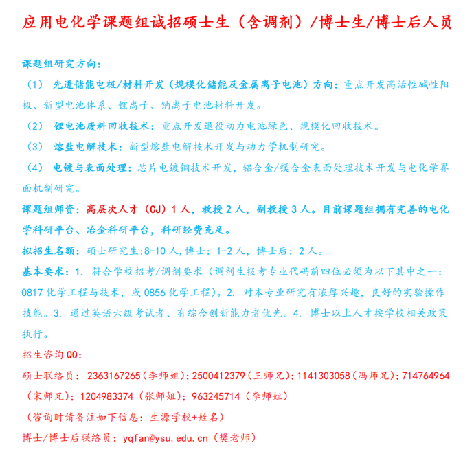 燕山大学应用电化学课题组诚招硕士生(含调剂)/博士生/博士后人员