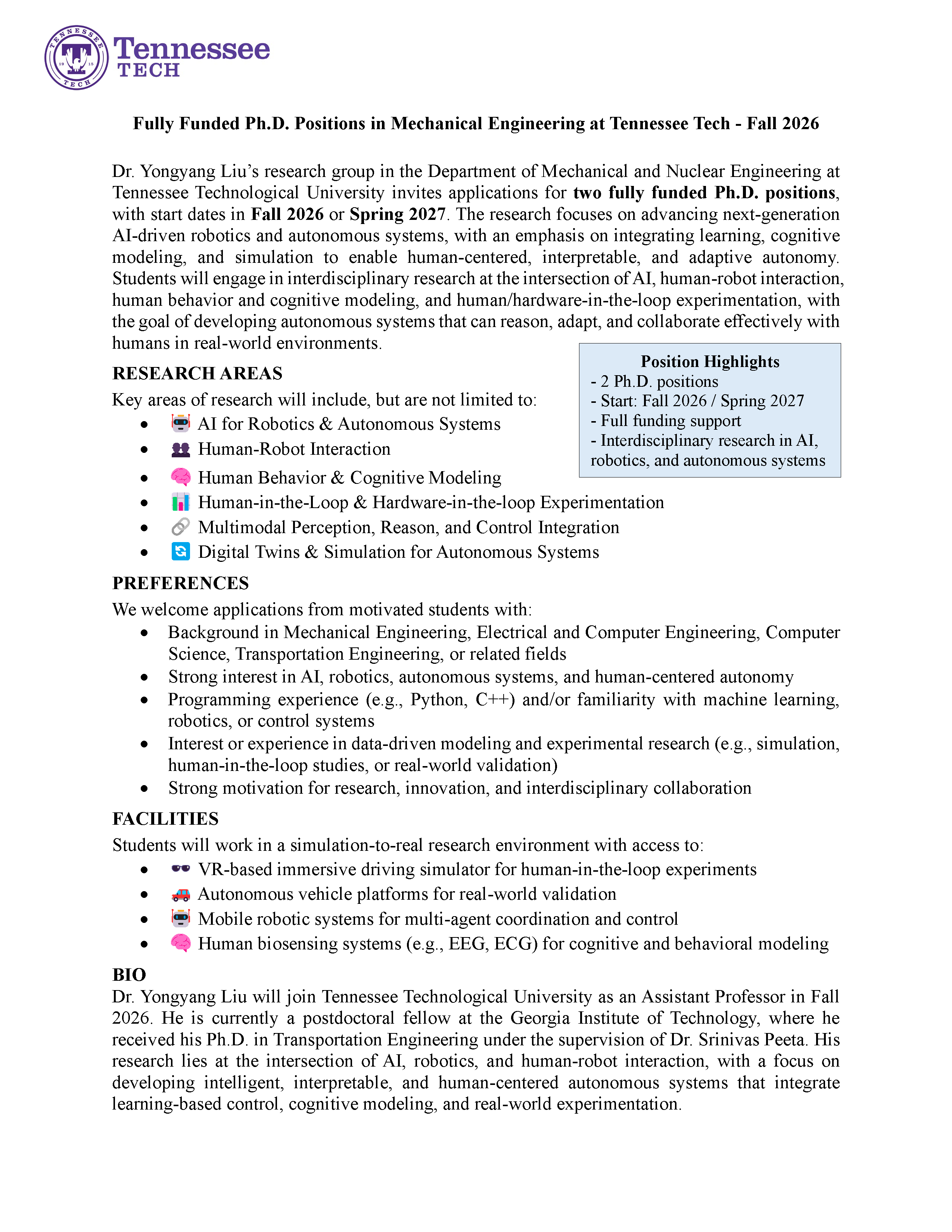 美国田纳西理工 | 人工智能/机器人/自动驾驶方向(全奖)