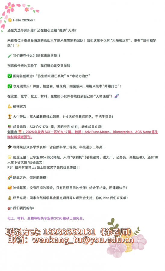 ? Hello 2026er! 还在为选导师纠结?还在担心进组“搬砖”无助? 来看看位于秦皇岛海滨的燕山大学纳米生物制药团队!我们这里不仅有“大海和远方”,更有“顶刊和梦想”!? ? 我们研究什么?(听起来就很酷!) 别再做传统的实验了!我们玩的是交叉学科: ? 国际首创概念:“仿生纳米淋巴系统” & “水动力治疗” ? 攻克硬骨头:肿瘤、帕金森、糖尿病、细菌感染...用纳米技术“降维打击”! 在这里,化学、化工、材料、生物的小伙伴都能找到自己的“天命课题”!? ? 硬核实力 ? 大牛带队:高大威教授核心领衔,1+4名优秀教师团队,手把手指导! ? 成果炸裂:SCI论文170+篇,发明专利41件,转化成果9项! 划重点??:2025年发表SCI一区论文17篇。包括:Adv.Func.Mater.、Biomaterials、ACS Nano等生物材料领域顶刊。 ? 导师荣获众多学术表彰:省自然科学二等奖、科技进步二等奖... ? 前途无量:已毕业80+师兄师姐,人均“收割机”(名校读博、进大厂、公务员、高校任教),还有16人拿下省优博/优硕论文! PS:组内有拿博士/硕士国家奖学金的优良传统!! ? 除此之外,你还能获得: ? 神仙氛围:没有压抑的等级,只有且研且乐的伙伴!组会不枯燥,团建超快乐! ? 经费充足:国家自然科学基金重点项目等N项资金支持,你的idea我们来买单! ? 我们要找的你: 化工、材料、生物等相关专业的2026级硕士研究生。 只要你眼里有光,心中有火,这里就是你的主场! ? 坐标:河北省秦皇岛市·燕山大学环境与化学工程学院 ? 邮箱:guoysu927@163.com(郭师姐)、wenkang_tu@ysu.edu.cn(涂老师) 发自小木虫IOS客户端 |