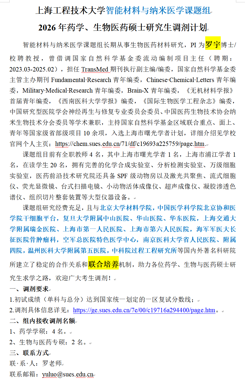 上海工程技术大学,优质资源课题组(yuluo@sues.edu.cn) 【硕士招生】(小红书、小木虫有帖 :https://muchong.com/t-16706261-1)【调剂急录】专业代码1007.1055.0806.0703.0780.0836等【速来】!你的意难平,这里用神仙氛围补偿 !药学学硕4名 生物与医药专硕2名 做纳米材料 涉及药剂合成细胞动物 智能材料与纳米医学…… 1.退行性疾病微环境调控材料 2.创面修复/院前快速止血材料 3.肿瘤的声动力/免疫调节/离子干扰/介入栓塞治疗/抗病毒 …… 【深造资源满格!科研与前途双丰收!】 联合培养资源丰富(北大、交大、复旦、中科院......就问你想不想去 )毕业的师姐师兄前途辉煌可鉴(交大、同济、北化工、中科院、深大等......尽一切人脉资源托举 )。完善丰厚的奖励机制(咱自己组内的科研奖、贡献奖、人气奖......想尽办法发奖......就硬塞money )。团建 茶话会 郊游课余生活丰富。 工位和实验室分离,科研条件很好。 氛围轻松,组内团结,读研体验感好,不会后悔。 来问就是了!!! 【调剂上岸点这里】别焦虑了!来咱们课题组,给你一个“绝对不后悔”的读研体验 !https://chem.sues.edu.cn/71/df/c19693a225759/page.htm 2.调剂具体信息详见:https://ge.sues.edu.cn/7e/00/c19716a294400/page.htm [ Last edited by 记事本2026 on 2026-3-31 at 16:51 ] |