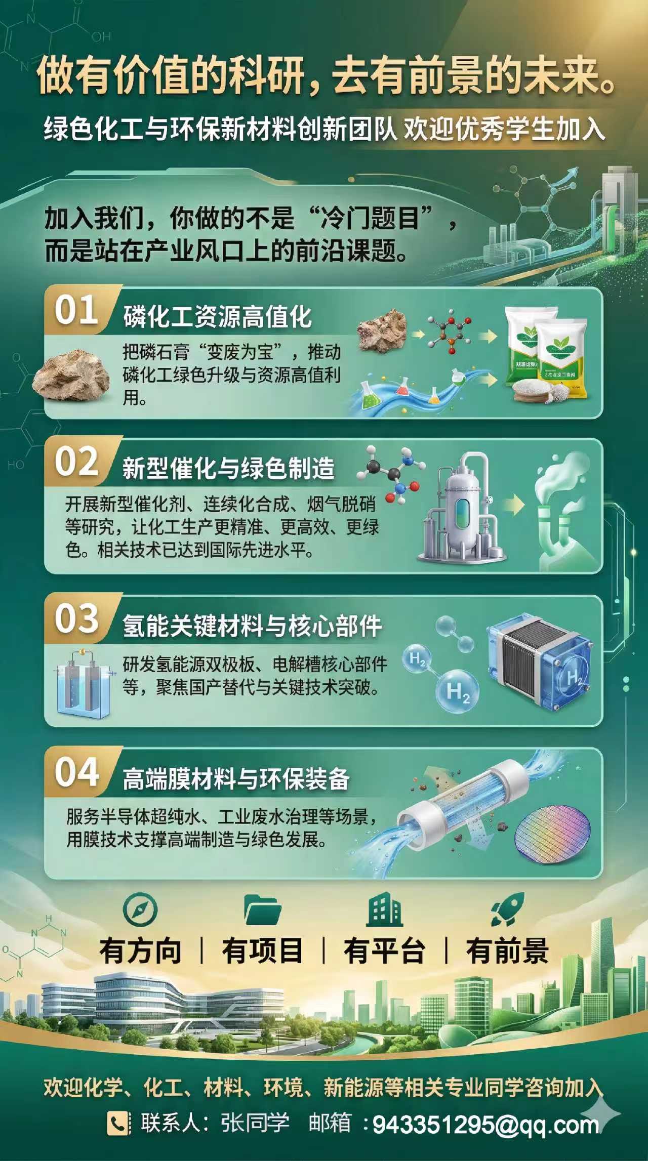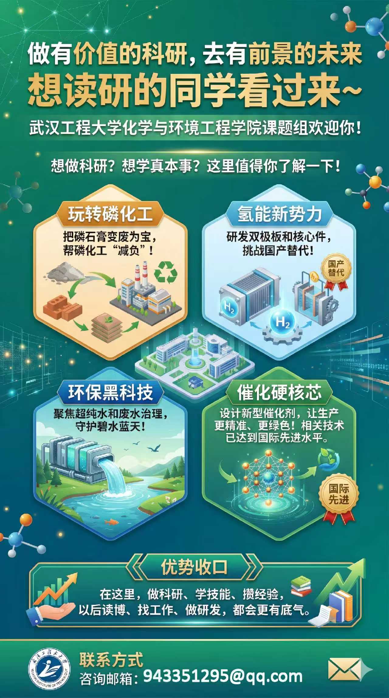 武汉工程大学化学与环境工程学院课题组欢迎你! 如果你对下列研究方向感兴趣,或者想在读研阶段踏踏实实做点科研、学点真本事,那真的可以了解一下我们课题组! 研究方向:每一个都“踩"在风口上! 在这里,你参与的项目可能就是未来的产业标杆: 玩转磷化工:把磷石膏变废为宝,做成对标国际水平的缓释肥,帮磷化工"减负”。 氢能新势力:研发氢能源双极板和电解槽核心件,挑战国产替代,填补技术空白。 环保黑科技:搞定半导体超纯水和废水治理,用高端有机膜技术守护碧水蓝天。 催化硬核芯:设计新型催化剂,让农药生产更精准、烟气脱硝更绿色(我们这项技术可是“国际先进”哦!)。 在这里,你不仅是“完成任务”,更重要的是能真正接触科研、参与课题、积累经验。平时会有文献阅读、实验训练、项目参与等安排,能够比较系统地锻炼科研思维、实验能力和写作表达能力。对于以后读博、找工作、做研发,都会有帮助。 偷偷说一句,我们课题组的毕业生超容易找工作哦! 联系方式 邮箱:943351295@qq.com |