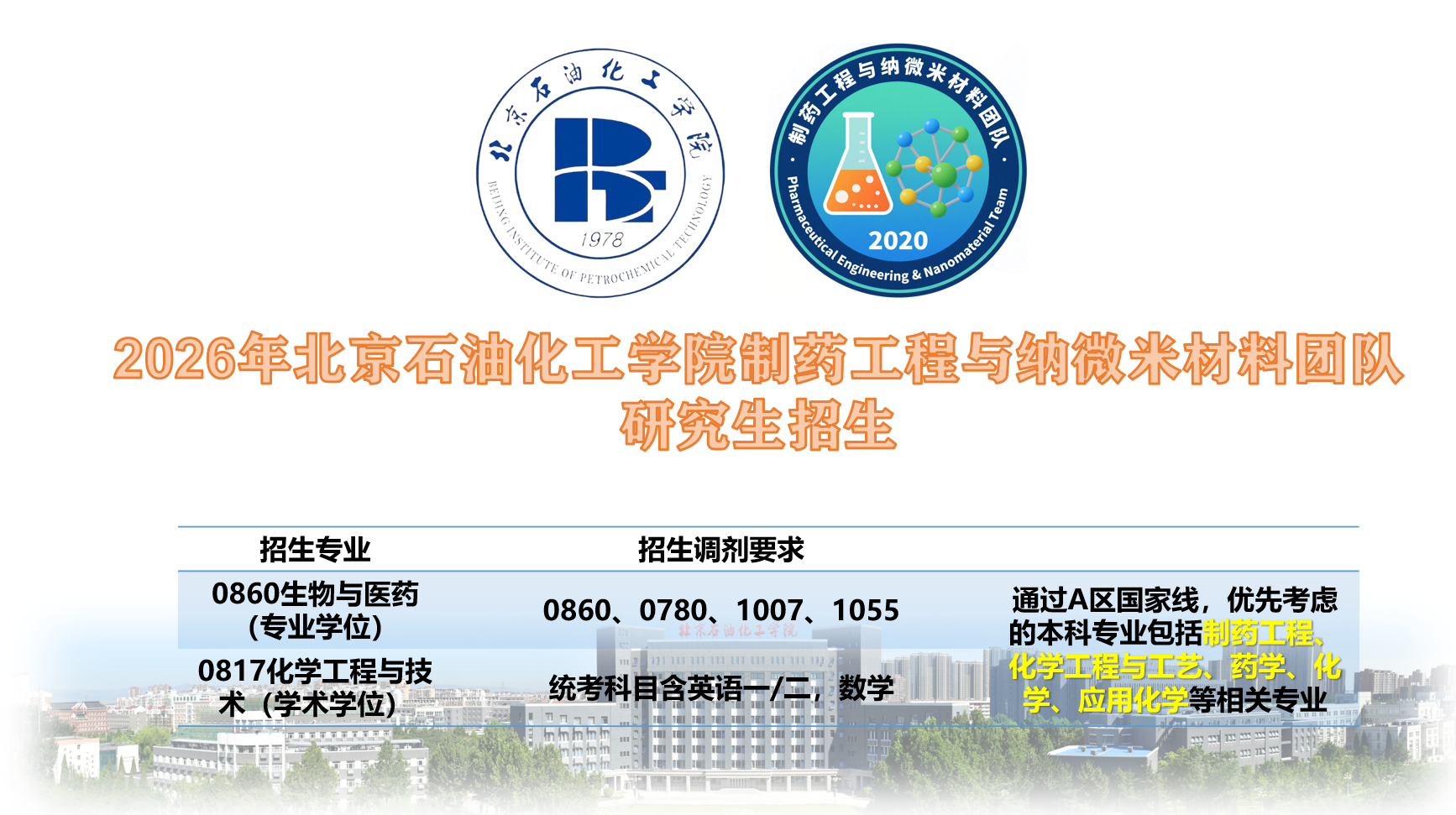 招收: 1、生物与医药的专业学位硕士(优先考虑0860生物与医药专业的考生,可接受0780药学、1007药学专业的考生) 2、化学工程与技术学术学位硕士(08工学(英一/英二、数一/数二/数三)的考生,优先考虑材料、化工、制药环境等相关专业,如0805材料科学与工程、0817化学工程与技术、0830环境科学与工程、0822轻工技术与工程、0821纺织科学与工程、0806治金工程、081902矿物加工工程、080706化工过程机械、082003油气储运工程等) 一、团队简介 制药工程与纳微米材料团队依托于北京石油化工学院恩泽生物质精细化工北京市重点实验室。长期从事纳米晶体材料的高通量合成、人工智能数据挖掘、化合物构效关系研究、油品清洁处理和高效转化以及制药关键工艺智能化研究,主持或参与多项国家级、省部级及企业科研项目。 团队成员由北京石油化工学院、中国石油大学(北京)、中国石油天然气集团股份有限公司、首都医科大学等多家单位多领域专家组成。 二、研究方向: 1、制药关键工艺的在线监测与智能控制 2、功能材料的合成与应用 更多信息请访问团队主页,欢迎大家推荐与咨询。https://www.pharmeng.cn/ 三、奖助学金等条件丰厚 1、奖学金系列包括新生奖学金(覆盖面100%,一等奖1万元/生;二等奖8000元/生;三等奖4000元/生)、学业奖学金(覆盖面60%)、国家奖学金、专项奖学金和捐资助特设奖学金,其中专项奖学金分为学术成果与学科竞赛奖学金、企业实践奖学金、社会工作奖学金和国际研修奖学金。 2、助学金系列包括国家助学金、国家助学贷款和学校助学金(”三助一辅“岗位津贴)等,三年学制年限内,每人每年享有7000元的国家助学金,覆盖面100%。 3、研究生毕业阶段还可申请研究生优秀学位论文奖、校级和北京市级优秀研究生毕业生等。具体奖助事宜以北京石油化工学院相关政策为准。 4、每月发放科研津贴,另有各类补贴和奖励(500-5000不等)。 5、定期组织丰富多彩的文体娱乐活动。 四、多渠道人才培养模式 1、参加国内外学术会议(每人至少1次),参加中国石油、中石化等大型国企实习实践。 2、每年派送研究生前往中科院过程所、首都医科大学等知名高校及科研院联合培养(培养期限为2年)。 符合要求且有意愿的同学在团队官网”2026年制药工程与纳微米材料团队研究生报名系统“报名并添加招生联系人微信。https://www.pharmeng.cn/ |