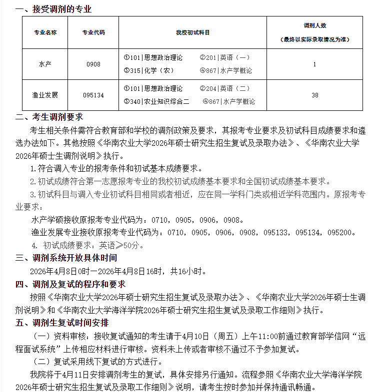 华南农业大学招收渔业发展调剂研究生