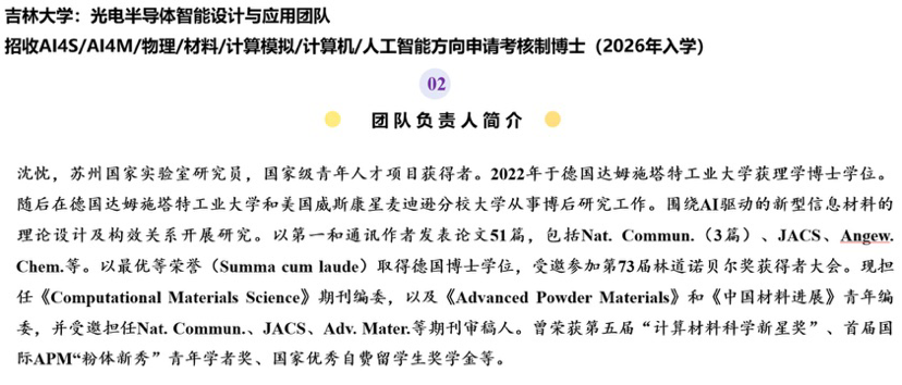 吉林大学:光电半导体智能设计与应用团队 招收AI4S/AI4M/物理/材料/计算模拟/计算机/人工智能方向申请考核制博士(2026年入学) 发自小木虫IOS客户端 |