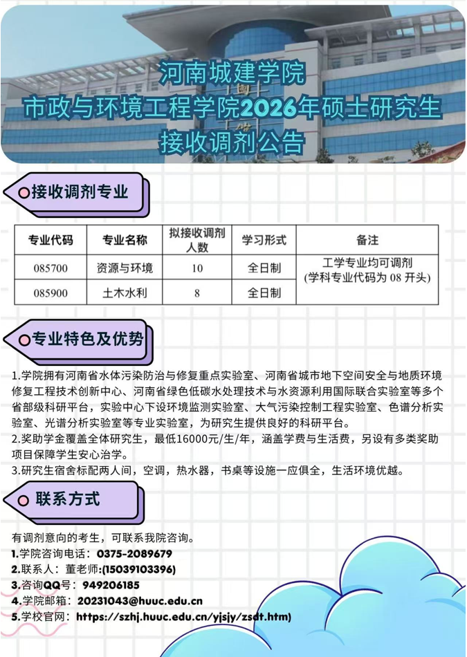 河南中部某本科高校 资源与环境(专硕)研究生 招生信息 我校坐落于河南中部,是一所特色鲜明的本科高校,现面向全国招收2026年资源与环境专业硕士(专硕)研究生,聚焦环境工程相关领域,培养具备扎实专业素养和实践能力的复合型人才。 招生方向围绕环境工程核心领域,涵盖污染物控制、环境治理、资源循环利用等,依托学校完善的教学科研平台和优质师资,为学生提供良好的学习科研环境与实践机会。 报考要求:接受环境工程、环境科学、生态学、给水排水工程、计算机等相关专业本科毕业生报考,一志愿过国家A区线,欢迎有调剂意愿的考生积极联系。 我校秉持因材施教理念,注重学生科研能力与实践能力培养,助力学生成长成才。有意向者请发送个人简历及相关材料至指定邮箱,咨询与报名同步进行,诚邀有志于环境领域发展的学子加入! 联系邮箱:longxiaojing1987@163.com |