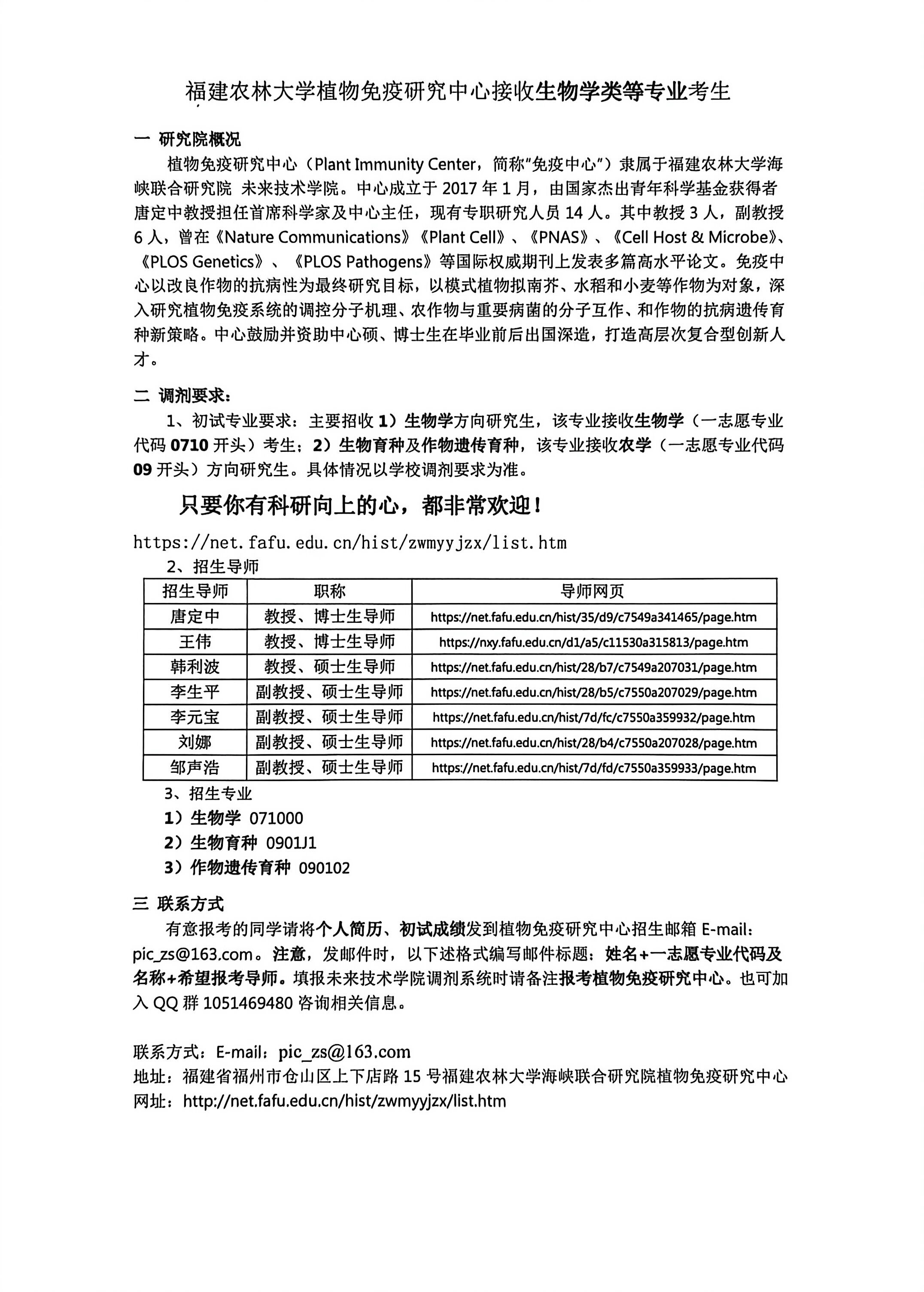 福建农林大学-植物免疫中心 招生&调剂 宝子们!正在找生物学、植物学、农学方向的26届同学看过来👀 ,我们植物免疫中心招生&调剂开始啦✅ 既有拿得出手的科研硬实力,更有暖到心底的团队氛围,上岸即解锁“高质量科研+神仙队友”双重快乐~ 💡 先亮硬实力|领域领先,不做“陪跑”科研 咱团队深耕免疫领域多年,聚焦植物免疫信号通路、作物抗病基因挖掘、细胞器免疫等前沿方向,紧跟国际科研潮流 ✅福农优势:科研顶级平台 + 经费充足 + 导师负责 + 同门互助 + 福州宜居,科研生活双优 ✅ 《植物免疫中心》隶属福建农林大学“科研硅谷”——海峡联合研究院,依托全国重点实验室,仪器设备拉满,不用为实验条件发愁 ✅ “国家杰青”领衔,TOP论文常态化产出,高水平成果不断,跟着大佬导师,轻松解锁科研天花板,少走弯路、快速成长✨ ✅ 承担国家自然科学基金、重点研发计划等重大项目,科研经费充足 ✅ 研究领域:围绕拟南芥、水稻、小麦等作物病原致病机制与植物抗病机制研究,聚焦植物真菌与细菌病害,以粮食安全与农业可持续发展为核心导向,导师全程引路,轻松解锁科研天花板。 ❤️ 再讲软实力|和谐团队,科研路上有人陪 最最最加分的就是我们的团队氛围!拒绝“导师放养”“同门内卷”,主打一个同心同行、互帮互助👇 ✅ 导师温柔负责,不PUSH、不压榨,从选题、实验到论文全面负责;贴合每位学生的基础与需求,设置不同研究课题,兼顾科研提升与个人成长✨ ✅ 同门相处超融洽,师兄师姐分享实验经验、避坑指南,不会藏着掖着,遇到难题一起讨论、一起解决,不用一个人硬扛 ✅ 定期组会不压抑,没有严肃的层级感,可以大胆发表自己的想法,哪怕是小白也能快速融入,慢慢成长 ✅ 组内聚餐、团建多多,劳逸结合,科研再忙也有小美好,治愈所有科研内耗 🌟 我们要这样的你 热爱植物免疫领域、有科研热情,踏实认真,愿意主动融入团队、全力以赴投入科研工作,不管你是基础扎实的学霸,还是肯努力、爱钻研的小白,我们都敞开怀抱,静待同行✨ 在这里,你不用孤军奋战,有优秀的导师引路、热情的师兄师姐;在这里,你能接触到领域最前沿的研究,实现科研能力的飞速提升,为未来读博深造、就业打下坚实基础~ 有意愿了解、加入免疫中心大团队的宝子,邮件联系15237319195@163.com,来件需附自我介绍和个人简历~ #考研 #调剂 #生物学 #植物学 #遗传学 #细胞生物学 #农学 #作物遗传育种 #生物化学与分子生物学 |