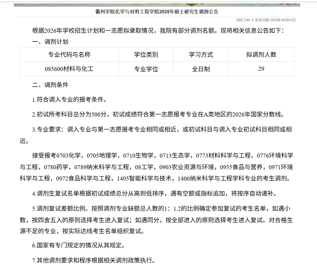 衢院化材学院调剂信息(欢迎0854电气、0855机械、0856及各位符合的同学咨询哦)