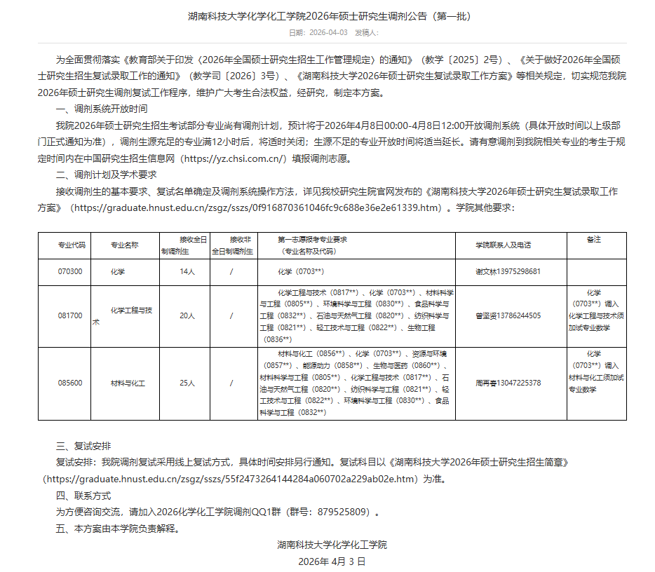 湖南科技大学2026接收化工类专业调剂硕士生