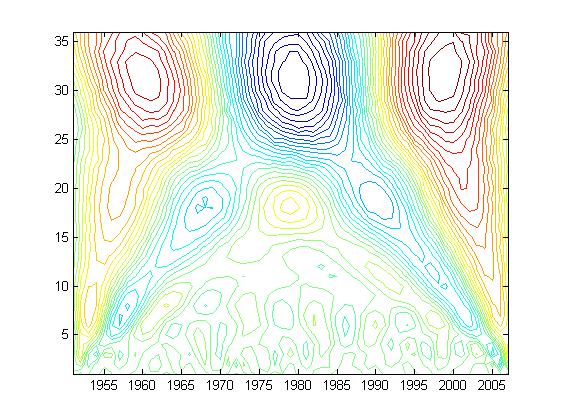 自己编写的小波变换程序,请指正! number=[6.6 6.0 6.3 5.8 6.5 4.7 5.0 5.8 6.5 5.9 7.0 5.9 6.3 6.0 5.7 5.8 6.3 6.3 4.5 6.0 6.2 6.1 6.9 5.6 7.4 5.3 5.9 6.2 6.4 5.8 6.1 7.1 6.9 6.1 5.6 6.1 6.0 7.0 7.3 7.4 6.7 6.8 7.0 7.5 7.5 6.9 7.7 8.7 7.5 6.9 7.0 7.9 7.9 8.0 7.0 7.3 8.5 ]; year=1951:10:2007; x=1951:1:2007; y=1:1:36; c=cwt(number,y,'morl'); [x,y]=meshgrid(x,y); d=contour(x,y,c,36); |