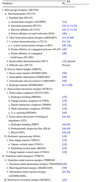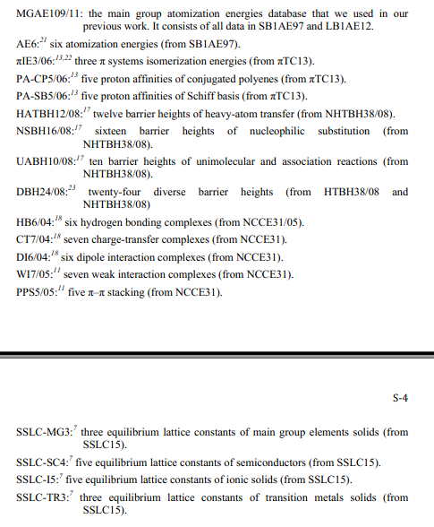 最近在用gaussian09里的m062x 所以查了一下相关资料 看看这个泛函怎么样 结果查到一个对比测试 但是看不懂 就发上来请教一下大家 请解释一下里面的那些AE IP EA HTBH NHTBHs都什么意思啊? 谢谢 MC-DFT test for M06-2X,M06,M05-2X,M05 Table 1 Mean Unsigned Errors (kcal/mol) on Various Types of Energies by the M06-2X , M06, M05-2X and M05 Functionals. AE IP EA HTBH NHTBHs average PA8 ABDE DC10 W3 (RMSE) M06-2X M06-2X MG3S 1.88 2.54 2.07 1.13 1.22 1.68 (2.21) 1.64 0.71 10.78 2.43 (4.10) MG3S aptz 2.28 2.70 1.55 1.14 1.37 1.89 (2.62) 2.06 0.79 13.45 2.90 (4.97) aptz apc2 1.80 2.39 1.40 1.09 1.34 1.60 (2.08) 1.75 0.79 9.54 2.23 (3.68) apc2 apc3 1.71 2.37 1.52 1.00 1.33 1.54 (1.98) 1.67 0.82 2.21 (3.57) apc3 pdz/MG3S 1.50 2.62 1.65 1.05 1.32 1.47 (1.97) 1.76 0.69 9.57 2.06 (3.75) pdz/MG3S pdz/ptz/apdz 1.47 3.05 1.95 0.97 1.21 1.46 (2.06) 2.42 0.98 9.62 2.62 (3.52) pdz/ptz/apdz pdz/apdz/aptz 1.66 2.69 1.29 1.10 1.37 1.55 (2.20) 2.03 0.95 12.02 2.25 (4.33) pdz/apdz/aptz pc1/pc2/apc1 1.73 2.23 1.53 0.95 1.19 1.51 (2.05) 1.68 0.79 9.17 1.96 (3.47) pc1/pc2/apc1 pc1/apc1/apc2 1.72 2.25 1.34 1.03 1.34 1.54 (2.06) 1.65 0.82 9.62 2.00 (3.38) pc1/apc1/apc2 6-31G(d)/6-311+G(d,p)/6-311+G(2d,2p) 1.43 2.53 1.69 1.24 1.16 1.43 (1.96) 1.88 0.67 14.32 3.59 (5.18) 6-31G(d)/6-311+G(d,p)/6-311+G(2d,2p) 6-31G(d)/6-311+G(d,p)/6-311++G(2d,2p) 1.39 2.54 1.70 1.26 1.19 1.42 (1.92) 1.85 0.69 13.99 3.77 (5.39) 6-31G(d)/6-311+G(d,p)/6-311++G(2d,2p) pdz/ptz/6-311+G(2d,p) 1.50 2.86 2.03 0.99 1.23 1.47 (2.09) 1.87 0.98 11.02 2.34 (4.46) pdz/ptz/6-311+G(2d,p) pc1/pc2/6-311+G(2d,p) 1.57 2.17 1.47 0.92 1.16 1.41 (1.96) 1.52 0.75 10.61 1.98 (3.63) pc1/pc2/6-311+G(2d,p) M05 M05 MG3S 2.50 2.88 2.96 1.93 2.11 2.38 (3.23) 2.15 5.99 16.42 3.19 (4.29) MG3S aptz 3.51 2.79 2.98 1.87 2.10 2.88 (3.99) 2.08 6.42 23.83 3.78 (4.99) aptz apc2 2.64 2.82 2.81 1.78 2.08 2.40 (3.26) 2.12 6.87 17.27 3.18 (4.16) apc2 pdz/MG3S 2.37 2.93 2.01 1.87 2.33 2.28 (3.13) 2.28 6.30 13.92 3.02 (4.23) pdz/MG3S pdz/ptz/apdz 2.21 2.91 2.41 1.66 1.78 2.09 (2.86) 2.37 7.86 14.16 2.81 (3.85) pdz/ptz/apdz pdz/apdz/aptz 2.49 2.71 2.35 1.67 2.79 2.40 (3.18) 2.31 7.87 15.16 3.05 (4.08) pdz/apdz/aptz pc1/pc2/apc1 2.41 2.83 3.14 1.66 2.03 2.27 (3.15) 2.21 2.62 8.56 3.00 (4.11) pc1/pc2/apc1 pc1/apc1/apc2 2.36 2.78 2.49 1.69 2.30 2.26 (3.11) 2.27 7.43 14.91 2.91 (3.99) pc1/apc1/apc2 6-31G(d)/6-311+G(d,p)/6-311+G(2d,2p) 2.44 3.01 2.49 2.02 2.31 2.38 (3.18) 6-31G(d)/6-311+G(d,p)/6-311+G(2d,2p) 6-31G(d)/6-311+G(d,p)/6-311++G(2d,2p) 2.54 3.02 2.52 2.04 2.36 2.44 (3.23) 6-31G(d)/6-311+G(d,p)/6-311++G(2d,2p) pdz/ptz/6-311+G(2d,p) 2.23 2.96 2.13 1.66 1.97 2.12 (2.85) pdz/ptz/6-311+G(2d,p) pc1/pc2/6-311+G(2d,p) 2.39 2.77 3.21 1.64 2.04 2.26 (3.12) pc1/pc2/6-311+G(2d,p) AE IP EA HTBH NHTBHs average PA8 ABDE DC10 W3 (RMSE) M05-2X M05-2X MG3S 2.28 3.54 2.03 1.34 1.72 2.07 (2.81) 1.47 0.69 10.67 2.88 (5.28) MG3S aptz 2.42 3.43 1.63 1.38 1.64 2.11 (3.00) 1.44 0.76 11.72 3.69 (6.17) aptz apc2 2.67 3.17 1.63 1.38 1.47 2.19 (2.92) 1.16 0.71 9.56 3.04 (5.05) apc2 pdz/MG3S 2.25 3.53 2.08 1.35 1.75 2.07 (2.81) 1.45 0.70 10.69 2.93 (5.33) pdz/MG3S pdz/ptz/apdz 2.18 3.81 2.11 1.34 1.99 2.09 (2.98) 1.81 0.84 10.61 3.22 (5.64) pdz/ptz/apdz pdz/apdz/aptz 2.20 3.46 1.81 1.35 1.53 1.98 (2.88) 1.49 0.83 11.52 3.28 (5.86) pdz/apdz/aptz pc1/pc2/apc1 2.28 3.00 1.54 1.30 1.40 1.94 (2.89) 1.36 0.72 10.96 2.38 (4.53) pc1/pc2/apc1 pc1/apc1/apc2 2.39 3.03 1.46 1.31 1.33 1.99 (3.02) 1.09 0.83 12.76 2.36 (4.31) pc1/apc1/apc2 6-31G(d)/6-311+G(d,p)/6-311+G(2d,2p) 2.52 3.38 2.11 1.46 2.06 2.27 (3.07) 6-31G(d)/6-311+G(d,p)/6-311+G(2d,2p) 6-31G(d)/6-311+G(d,p)/6-311++G(2d,2p) 2.40 3.37 2.12 1.48 2.02 2.21 (2.98) 6-31G(d)/6-311+G(d,p)/6-311++G(2d,2p) pdz/ptz/6-311+G(2d,p) 2.21 3.63 2.27 1.27 1.91 2.08 (2.96) pdz/ptz/6-311+G(2d,p) pc1/pc2/6-311+G(2d,p) 1.95 3.07 1.92 1.24 1.46 1.80 (2.58) 1.41 0.66 9.56 6.95 (9.16) pc1/pc2/6-311+G(2d,p) AE IP EA HTBH NHTBHs average PA8 ABDE DC10 W3 (RMSE) M06 M06 MG3S 2.64 3.27 1.82 2.18 2.28 2.48 (3.35) 1.81 2.02 9.28 2.67 (3.84) MG3S aptz 2.72 2.42 1.72 2.02 2.00 2.38 (3.26) 1.84 2.29 15.81 2.98 (4.16) aptz apc2 2.44 2.74 2.07 1.89 1.90 2.24 (2.99) 1.81 2.91 11.48 2.53 (3.62) apc2 pdz/MG3S 2.66 3.32 1.66 2.16 2.21 2.47 (3.37) 1.85 2.05 8.85 2.70 (3.85) pdz/MG3S pdz/ptz/apdz 2.18 2.67 2.15 1.60 1.83 2.04 (2.76) 2.06 2.88 9.87 2.49 (3.44) pdz/ptz/apdz pdz/apdz/aptz 2.48 2.44 1.40 1.89 2.05 2.23 (3.06) 1.93 2.47 13.23 2.75 (3.81) pdz/apdz/aptz pc1/pc2/apc1 2.37 2.66 1.91 1.76 1.66 2.12 (2.94) 1.96 3.02 10.19 2.50 (3.65) pc1/pc2/apc1 pc1/apc1/apc2 2.44 2.78 1.69 1.91 1.95 2.23 (2.99) 2.72 2.87 11.51 2.53 (3.60) pc1/apc1/apc2 6-31G(d)/6-311+G(d,p)/6-311+G(2d,2p) 2.48 3.69 1.99 2.33 2.56 2.51 (3.25) 6-31G(d)/6-311+G(d,p)/6-311+G(2d,2p) 6-31G(d)/6-311+G(d,p)/6-311++G(2d,2p) 2.53 3.70 2.00 2.04 2.66 2.51 (3.22) 6-31G(d)/6-311+G(d,p)/6-311++G(2d,2p) pdz/ptz/6-311+G(2d,p) 2.31 3.38 1.77 1.63 2.07 2.18 (2.93) pdz/ptz/6-311+G(2d,p) pc1/pc2/6-311+G(2d,p) 2.42 2.92 2.10 1.66 1.63 2.15 (2.93) pc1/pc2/6-311+G(2d,p) TABLE 2 Computational Costa,b M06-2X MG3S 286 cc-pVDZ/MG3S 323 6-31G(d)/6-311+G(d,p)/6-311+G(2d,2p) 250 6-31G(d)/6-311+G(d,p)/6-311++G(2d,2p) 259 cc-pVTZ 297 aug-cc-pVTZ 1177 cc-pVDZ/cc-pVTZ/aug-cc-pVDZ 442 pc2 297 apc2 1268 pc1/pc2/apc1 438 pc1/pc2/6-311+G(2d,p) 459 aTested using computers with Intel Q6600 CPU and a version of Gaussian 03 program optimized for the hardware architecture. bTotal CPU time in seconds to calculate C5H5N, C2Cl4, C4H4O, C4H4S, C4H5N, CF3CN, and SiCl4. |