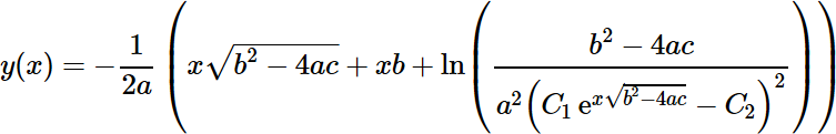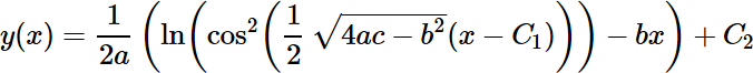 (2*a*β-b)/(4*a*β)*Ln{[y'+b/(2*a)]-β}+ (2*a*β+b)/(4*a*β)*Ln{[y'+b/(2*a)]+β}=C-a*y