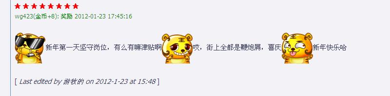 wg423(金币+3): 可以到http://emuch.net/bbs/viewthread.php?tid=3548836&pid=4358406&page=93#pid4358406这里报到 2012-01-24 17:27:04 wg423(金币+200): http://emuch.net/bbs/viewthread.php?tid=4076634&fpage=1活动报销 2012-02-04 14:34:14 wg423(金币+10): 2012-02-04 14:34:19