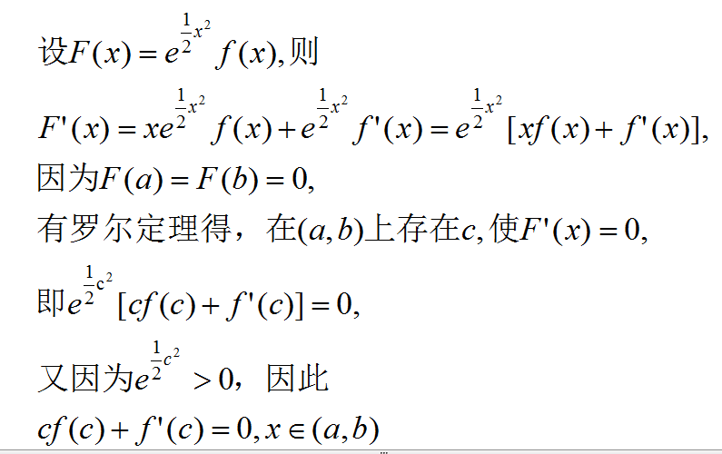 设函数f(x)在[a,b]内可导,连续,f(a)=f(b)=0, 证明: 在(a,b)内存在c使得cf(c)+f ’(c)=0. |