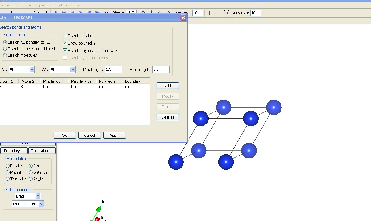 Edit-->Bands,或者Ctrl+B, 选中两个成键原子,填写键长范围,然后添加!