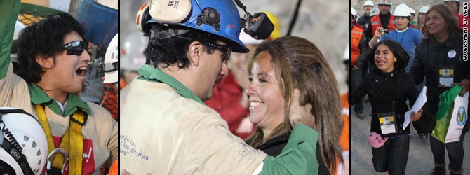 Throughout the process, Pinera stood outside the hole, greeting each arrival with a warm embrace. "We had promised to look until we found them," Pinera said. "We can all feel proud to be Chilean."