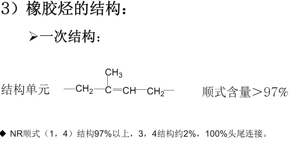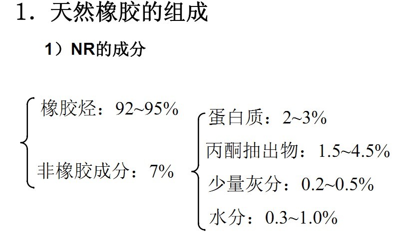 新鲜胶乳成分 橡胶烃 20-40 水溶物 1-2 蛋白质 1.5-2.8 灰分 <1 类脂化合物 1-2.5 水 55-75 橡胶烃绝大多数是顺式1,4聚异戊二烯,平均分子量约为3×105。 胶乳中的胶粒绝大部分呈球形,粒径最大者约为3um,最小者约为0.015um,平均粒径为0.5um左右。大约70%的粒径在0.2um以上,大部分粒径小于0.2um,分布在0.1um附近的最多。粒子的数目:1g40%干胶含量的胶乳中约有7.4× 1012个粒子。 利用紫外光、显微镜等观察确认,绝大多数胶粒是球形粒子,即使在新鲜状态下,也是由两个或更多个直径小得多的粒子构成的,但这些粒子间没有真正的聚结或合并。橡胶粒子的结构通常认为由三个部分组成:最内的是一团黏稠的溶胶体;中间层是固体的或凝胶体的橡胶层;最外面是一层吸附保护膜,由蛋白质、类脂等构成。 |