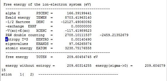 energy without entropy是什么意思?物理意义是什么呢?entropy什么是啊??? 什么时候用TOTEN,什么时候用EENTRO,这两者有什么区别呢?????? 也有人用tail -1 OSZICAR,这又是什么呢??? TOTEN和EENTRO各是什么意思呢?有什么物理意义呢? |
