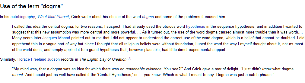 不就是DNA、RNA、蛋白质倒来倒去,这也称得上法则 central dogma就直接翻译成 中心,也太直接了 Use of the term "dogma" In his autobiography, What Mad Pursuit, Crick wrote about his choice of the word dogma and some of the problems it caused him: I called this idea the central dogma, for two reasons, I suspect. I had already used the obvious word hypothesis in the sequence hypothesis, and in addition I wanted to suggest that this new assumption was more central and more powerful. ... As it turned out, the use of the word dogma caused almost more trouble than it was worth.... Many years later Jacques Monod pointed out to me that I did not appear to understand the correct use of the word dogma, which is a belief that cannot be doubted. I did apprehend this in a vague sort of way but since I thought that all religious beliefs were without foundation, I used the word the way I myself thought about it, not as most of the world does, and simply applied it to a grand hypothesis that, however plausible, had little direct experimental support. Similarly, Horace Freeland Judson records in The Eighth Day of Creation: "My mind was, that a dogma was an idea for which there was no reasonable evidence. You see?!" And Crick gave a roar of delight. "I just didn't know what dogma meant. And I could just as well have called it the 'Central Hypothesis,' or — you know. Which is what I meant to say. Dogma was just a catch phrase." http://en.wikipedia.org/wiki/Central_dogma_of_molecular_biology [ Last edited by 602059625 on 2010-12-30 at 19:07 ] |