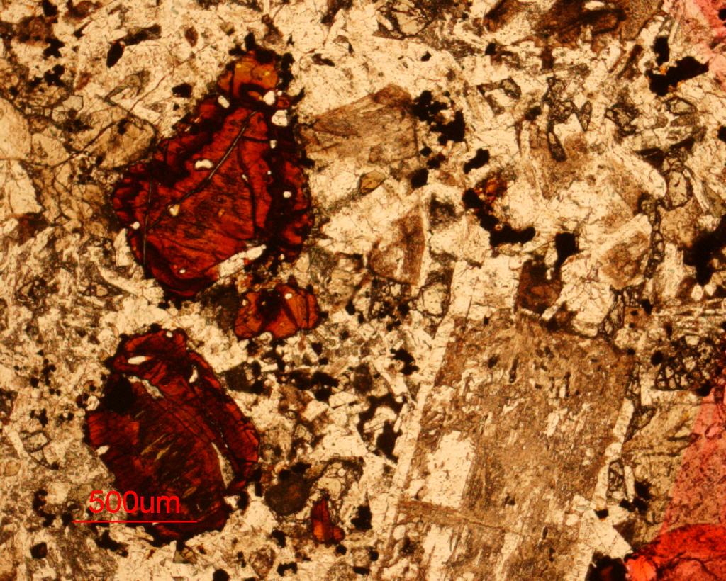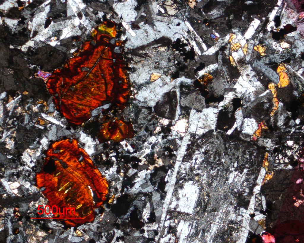 正交偏光和单片光下均为暗红色(带点橙黄色),具体的图片及探针数据如下: SiO2 FeO CaO Al2O3 MgO total 14.721 53.181 5.434 9.663 1.395 85.266 18.37 40.746 10.094 13.639 1.473 85.605 主要就是以上几种 其他的都是小于1的。 请教一下这是什么矿物 |