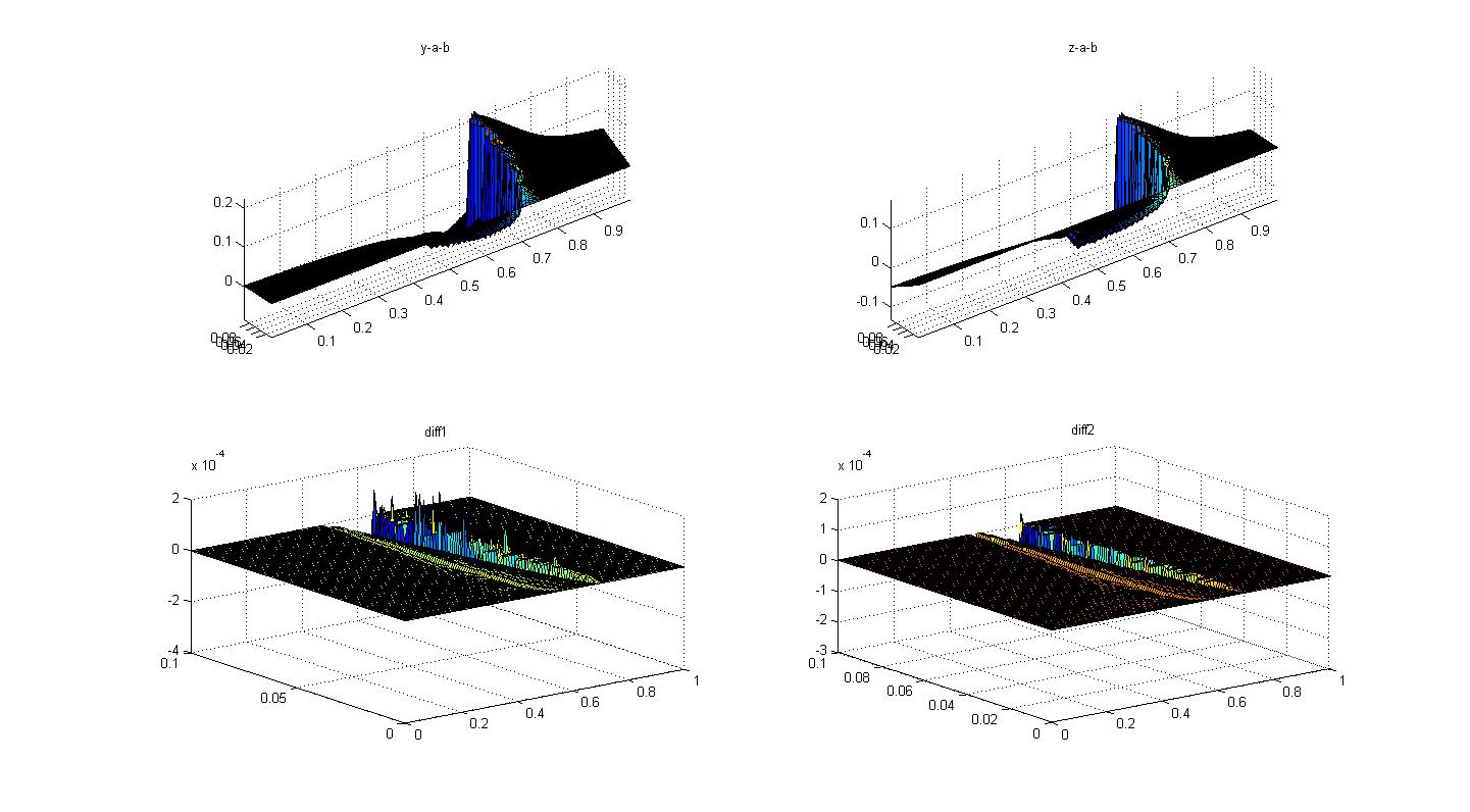 a 和 b 之间有什么关系吗? 如果 a 和 b 一一对应,可以用fsolve求解,大概如下: 函数: 求解: 要画二维曲线,b 为固定值,a在区间递增,求解方程,画图。 如果a 、b没有对应关系,求解出的应该是三维的曲面,大概如下: 在options选项中,可以设置求解算法,具体可参考帮助中的fsolve,我试了试用options=optimset('Display','off', 'ScaleProblem', 'Jacobian' );结果略有不同。 [ Last edited by xiegangmai on 2010-12-27 at 20:20 ] |
