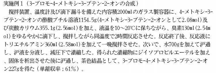 在配备搅拌装置、温度计和滴液漏斗的2000ml玻璃容器里,添加4-methoxy-3-butene-2-one的醋酸丁酯溶液1154.5g(2.08mol4-methoxy-3-butene-2-one)及碳酸钾355.1g(2.56mol),溶液温度保持10-20度,滴加130ml溴水(2.54mol),搅拌恒温反应2小时。反应结束后,在反应液中加360ml triethylamine(2.58mol),搅拌过夜。之后,加水700g过滤,分离滤液,减压蒸馏浓缩滤液。在得到的浓缩物中加Diisopropyl ether,固体析出后过滤,得到茶色结晶产物3-bromo-4-methoxy-3-butene-2-one 227g(收率61%)。