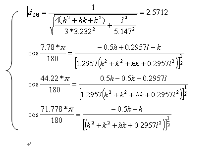 >> syms l h k;[l h k]=solve('cos(44.22*pi/180)=(0.5*h+0.2957*l-0.5*k)/sqrt(1.2597*(h^2+k^2+h*k+0.2957*l^2))','cos(71.778*pi/180)=(-0.5*k-h)/sqrt(h^2+k^2+h*k+0.2957*l^2)','2.5712*sqrt(4*(h^2+h*k+k^2)/(3*3.232^2)+l^2/5.147^2)=1') l = 0.1128765955661879120003069241437 h = -0.90654616138783667156059105710971 k = 1.2373847796375348971671727500807 此为Matlab准解析解 |