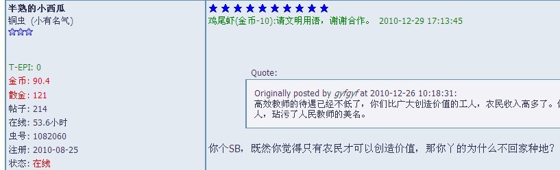 首先使用不文明用语,影响恶劣。希望能够改正,因此从轻处罚,只禁言一个月,如果不知悔改,将永久禁言。特此备案。 https://muchong.com/bbs/viewthread.php?tid=2736600&fpage=0&view=&highlight=&page=9 |