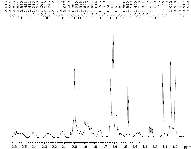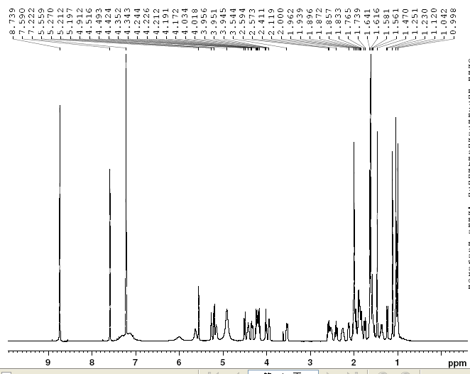 很明显 两个糖 这张图吡啶做的溶媒吧 苷元6个甲基? 5.6前面那个s峰是鼠李糖的糖端基信号,其甲基信号是1.6靠后面点的d峰,并且此峰的右边和某个s峰重合,你用尺子量量,是不是8HZ左右。(注意,也有可能是和鼠李糖同分异构的其他糖,得从糖环的信号耦合判断) 5.3前面那个brs峰是双键信号。 在双键旁边5.2的d峰信号,就目前碳谱的数据来看,无法判断是葡萄糖还是阿拉伯糖,因为两个糖的典型信号68.几和62.几都存在,但葡萄糖的可能性更大,因为阿拉伯糖内存在两个64-69信号。(注意,也有可能是和葡萄糖同分异构的其他糖,得从糖环的信号耦合判断) 最后来看碳谱上63.9那个信号,多半是苷元上某个甲基被羟基化了,成了-CH2-OH的碳信号。 接下来就看你怎么组合了,这个得通过大量的文献来确定,如果找不到相同的结构的数据,那就很难办,你必须去打HOHAHA和ROE以及QC来确认,同时也恭喜你,可能新结构来了。 另外,我想问下,你的氢谱中5.2和5.6附近的矮胖的brs峰是些啥啊? [ Last edited by cddryw on 2011-1-4 at 19:09 ] |