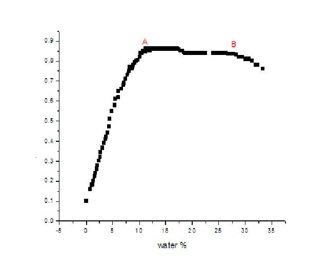 我在制备微乳液的时候,首先绘制微乳液的相图,寻找微乳区,但是在用电导率仪测定电导率时,出现了下面的曲线,我想问一下下图中的A点和B点哪个是由W/O转变为其他相的相转变点