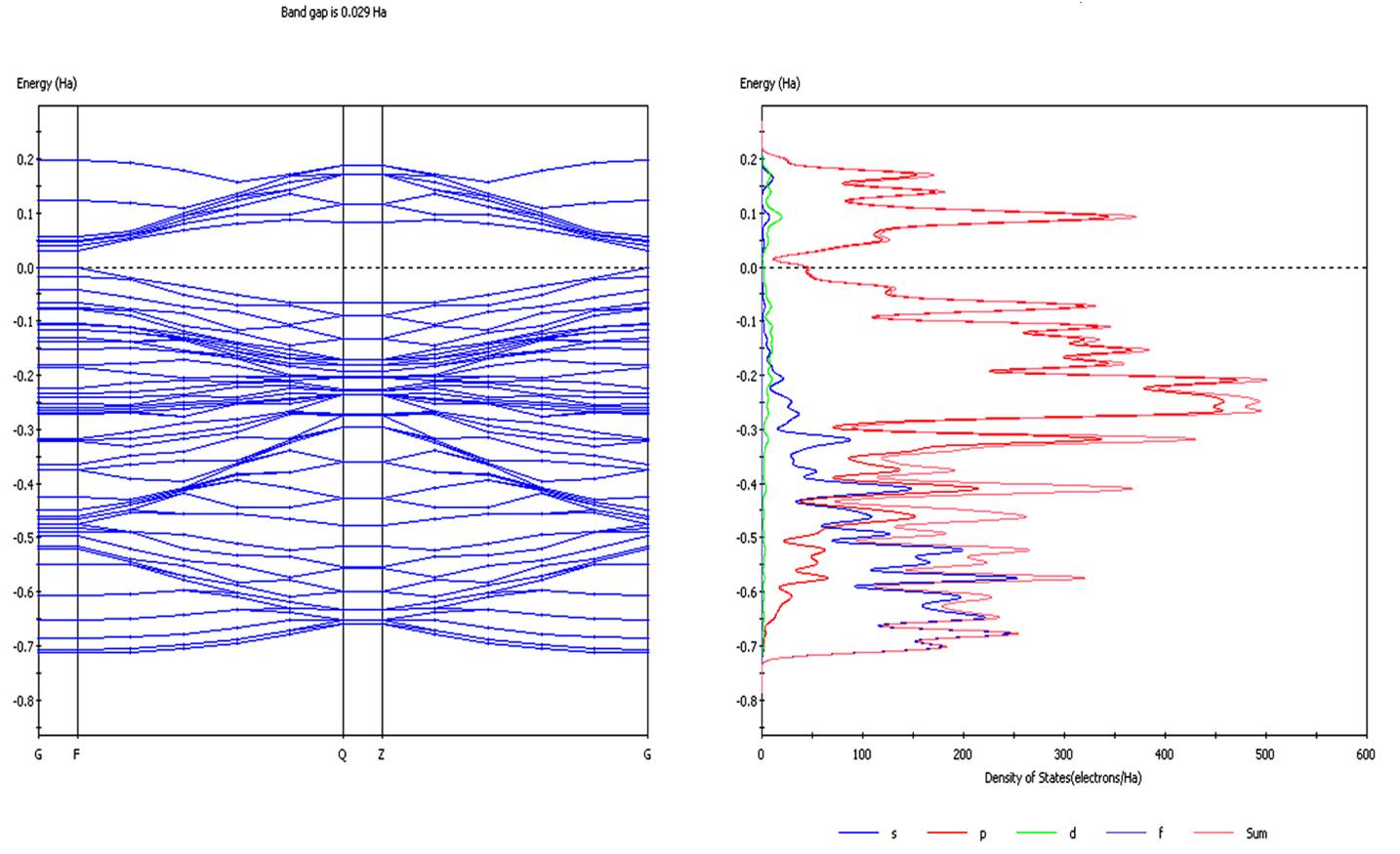 我用MS.Dmol3(GGA-PBE)计算了(10,0)半导体碳纳米管的能带结构和态密度,结果如下: