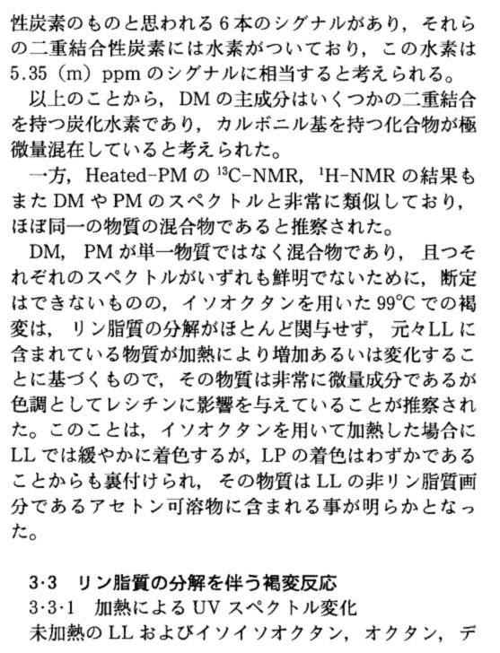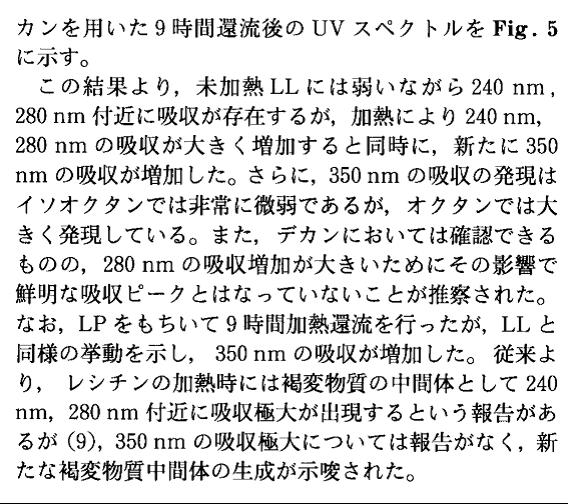 褐变物质的构造解析 DM以及PM用各种机器分析(IR,13C-NMR和1H-NMR)时,得到了非常相似的谱图。IR谱图上,1735cm-1虽然可以确认为羰基峰,但是13C-NMR谱图上,没有观测到羰基的信号。因此可以推测,DM的主要成分并不含羰基,13C-NMR谱图上没有出现的极微量的成分含有羰基。另外,13C-NMR谱图上,sp3领域的14ppm附近,观测到甲基的两个出峰。20-32ppm范围内能看到很多出峰,据DEPT的subspectra分析判断,虽然多数是2级碳但是也含有一些4级碳。根据这些结果考虑,DM的主要成分是具有长链的化合物。1H-NMR上的1.2-1.4ppm范围内的多重谱线信号也证实了这一点。另外,sp2领域内的5.4ppm附近,推测为二重结合的碳元素物质有6根谱线信号,二重结合碳元素上连有氢元素,这个氢元素体现在5.35(m)的这个信号上。 根据以上的实施,DM的主要成分是一些二重结合的碳氢化合物,具有羰基的化合物也极微量地混在其中。 一方面,Heated-PM的13C-NMR,1H-NMR的结果以及DM和PM的的谱图也非常类似,推测几乎为同一物质的混合物。 DM,PM并非单一物质而是混合物,并且,由于每个物质的谱图都不鲜明,虽然无法断定,但是可以推测使用isooctane在99度发生的褐变,和磷脂质的分解几乎没有关系,基于原先含在LL中的物质由于加热产生增加或者变化,该物质虽然非常微量,但是对于lecithin的色调变化起到了影响。使用isooctane加热情况下,LL虽然缓慢着色,LP仅有非常浅的着色这一情况也证明了这一点。可以明确,在LL的非磷脂质丙酮可溶物中含有。 伴随着磷脂质分解的褐变反应 加热引起的UV谱图变化 使用未加热的LL以及isooctane,octane和decane,9小时还流后的uv谱图如fig.5所示。 根据该结果,未加热的LL的谱图上240nm和280nm附近有这微弱的吸收,伴随着加热,240nm以及280nm的吸收增大的同事,新的350nm附近的吸收也增加了。350nm的吸收在isooctane的谱图上非常微弱,但是在octane的谱图上强烈显示。另外,在decane的 谱图上虽然也能确认到,但是推测由于280nm的吸收增加程度很大,由此影响,并没有成为非常明显的吸收峰。另外使用LP进行了9小时的加热还流,与LL的谱图现象相同,350nm的吸收增加了。此前虽然有报道显示lecithin在加热时作为褐变物质中间的,在240nm 280nm产生了极大吸收,但是350nm处的极大吸收并没有报道过,这一点也暗示了又新的褐变物质中间体的生成。 |