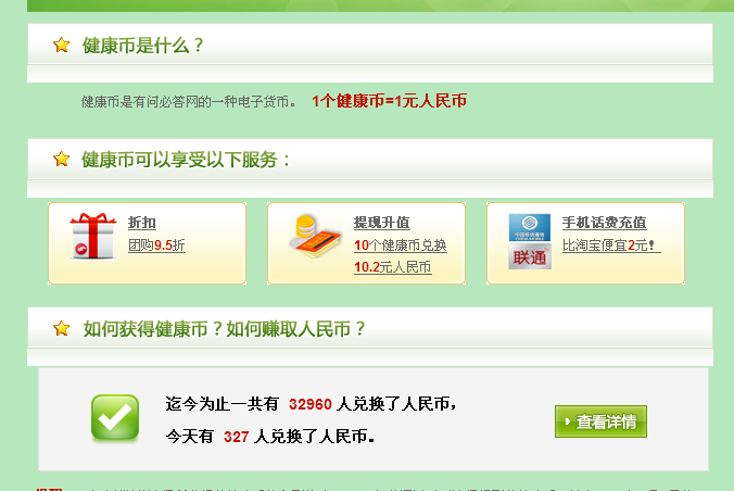 健康币是有问必答网的一种电子货币。 1个健康币=1元人民币